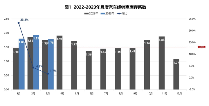 2023年4月10日,中国汽车流通协会发布2023年3月份“汽车经销商库存”调查结果:3月份汽车经销商综合库存系数为1.78,环比下降7.8%,同比上升1.7%,库存水平位于警戒线以上。