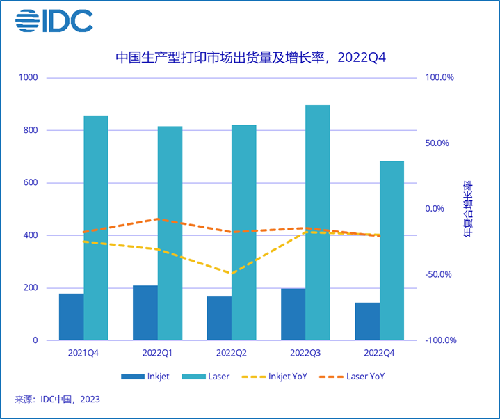IDC最新发布的《中国打印外设市场季度跟踪报告(2022年第四季度)》显示,2022年第四季度中国市场生产型打印机出货量同比下降20.2%,受疫情影响市场需求持续走低。IDC认为,在2022年疫情持续影响下生产型打印机市场已经探底,随着12月疫情政策放开,生产型打印机市场将在2023年迎来复苏。