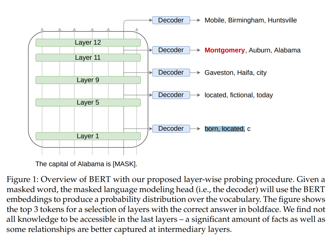一篇2021年的论文显示,研究人员通过分层探测程序,来研究Google基于Transformer架构的Bert是如何储存知识的,发现并不是所有知识都在最后几层获得,大量的事实与一些关系更多是在中间层,比如给Bert一个问题“阿拉巴马州的首府是?”,在Transformer的架构中,可以发现正确答案“蒙哥马利(Montgomery,上图中标红)”是储存在11层和12层之间,但一些逻辑推理中所需要的词汇,比如located(位于)、today(今天)、city(判断任务中的capital这个词,此时指的是城市),以及其他地名知识Gaveston(加尔维斯敦,美国得克萨斯州东南部港市)、Haifa(以色列城市海法)等等,储存在5-11层之间。