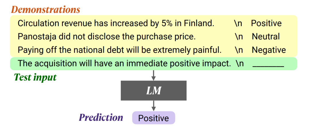 上图给出了一个大语言模型如何使用ICL进行决策的例子。首先,ICL需要一些示例来形成一个演示上下文,这些示例通常都是用自然语言编写的(上图中标黄的部分)。然后ICL将查询的问题(即你需要预测标签的input,上图中标绿的部分)和一个上下文演示(一些相关的例子)连接在一起,形成带有提示的输入,并将其输入到语言模型中进行预测(上图中最下方的结果)。