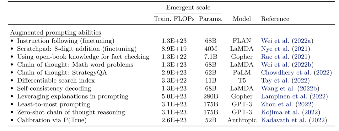 ICL情形下,出现能力涌现所对应的模型规模。图片来源:Google、Stanford、DeepMind:Emergent Abilities of Large Language Models