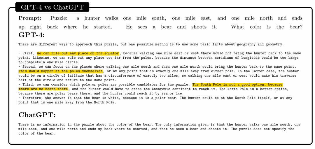 我们看到ChatGPT直接放弃了回答,但GPT-4的回答是正确的,答案是白色,并且GPT-4展开推理分析:因为猎人先向南,再向东最后向北,分别走了一英里,恰好回到了原点,这种情况只可能发生在北极,而那里生活着北极熊,所以是白色的。