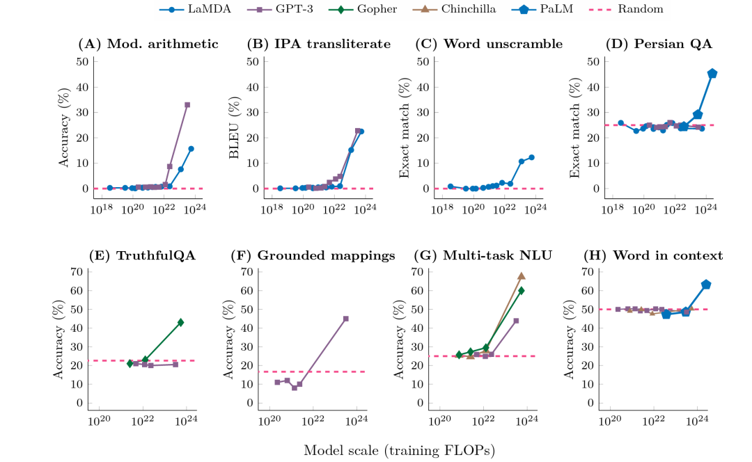 我们在上文分析了大模型在哪些任务中出现了涌现现象,紧接着一个更具有短期价值的问题出现了——多大的模型规模会出现“涌现”现象?