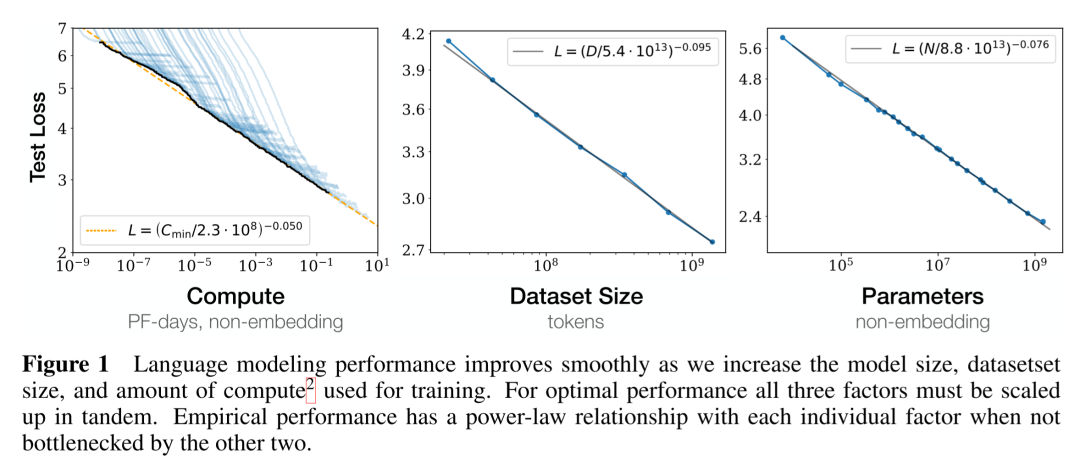 当我们独立增加参数规模、数据集规模和延长模型训练时间,大语言建模的性能就会提高;图片来源:OpenAI:Scaling Laws for Neural Language Models