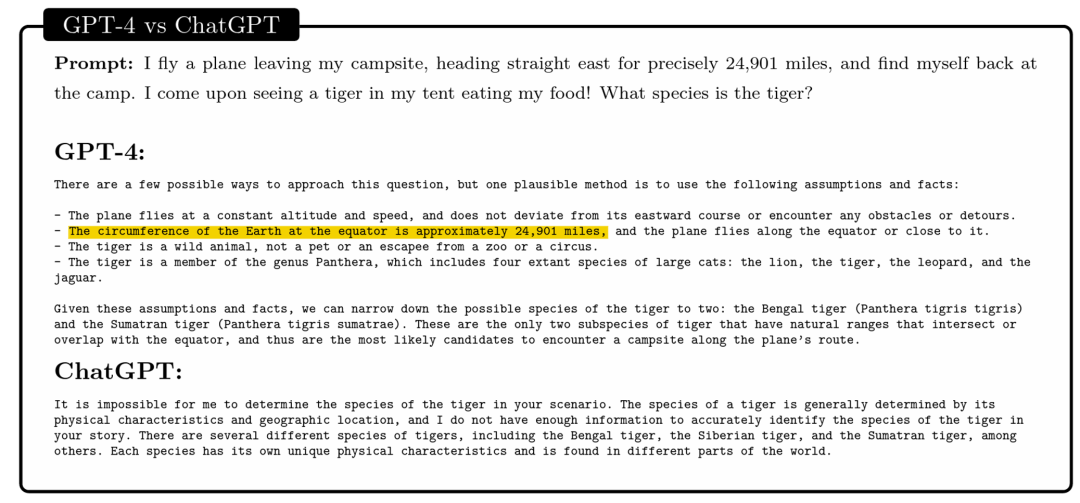 同样的,ChatGPT直接放弃了回答,但GPT-4给出了正确的答案:任何生活在赤道上的老虎物种,例如孟加拉虎和苏门答腊虎。在这个谜题里,AI需要知道地球赤道长24901英里,只有在赤道上才能向东或向西行驶并返回同一点,以及哪些老虎物种生活在赤道上。