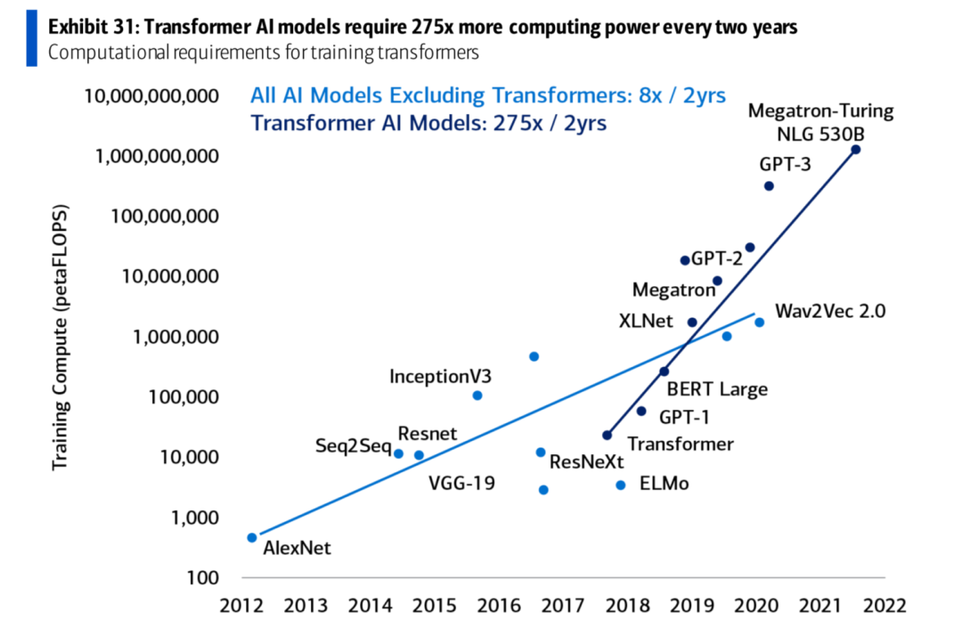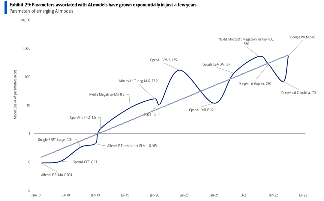 近年来,大语言模型在参数规模和算力上都大幅提升;图片来源:BofA Global Research