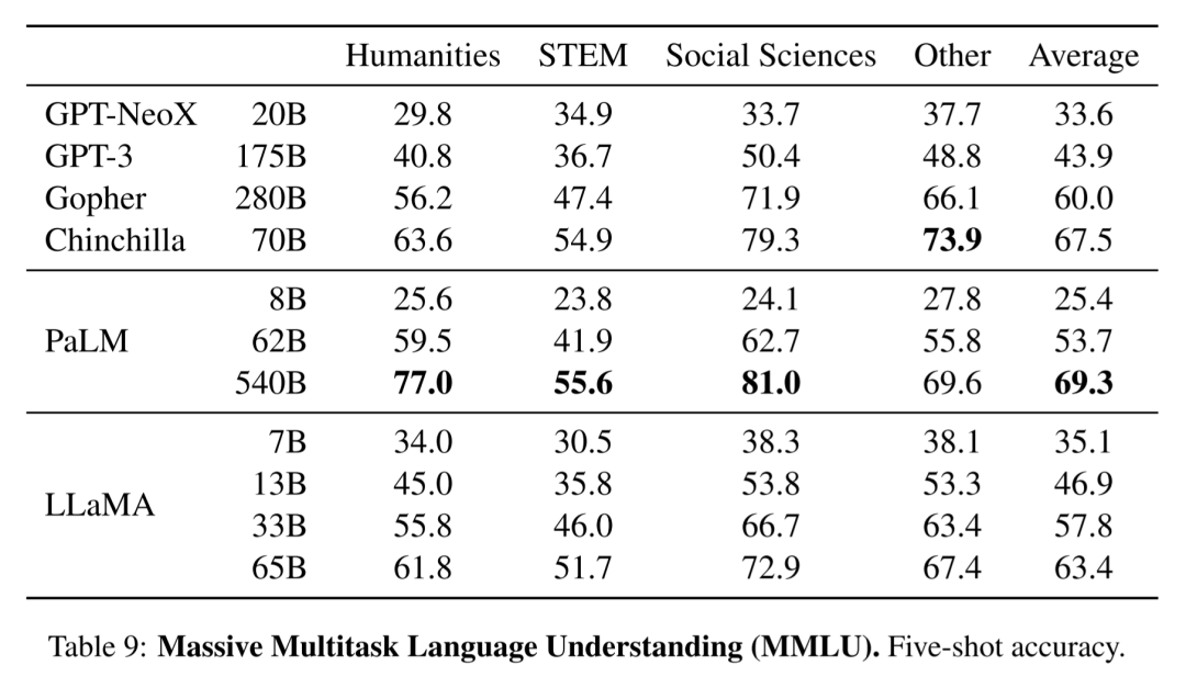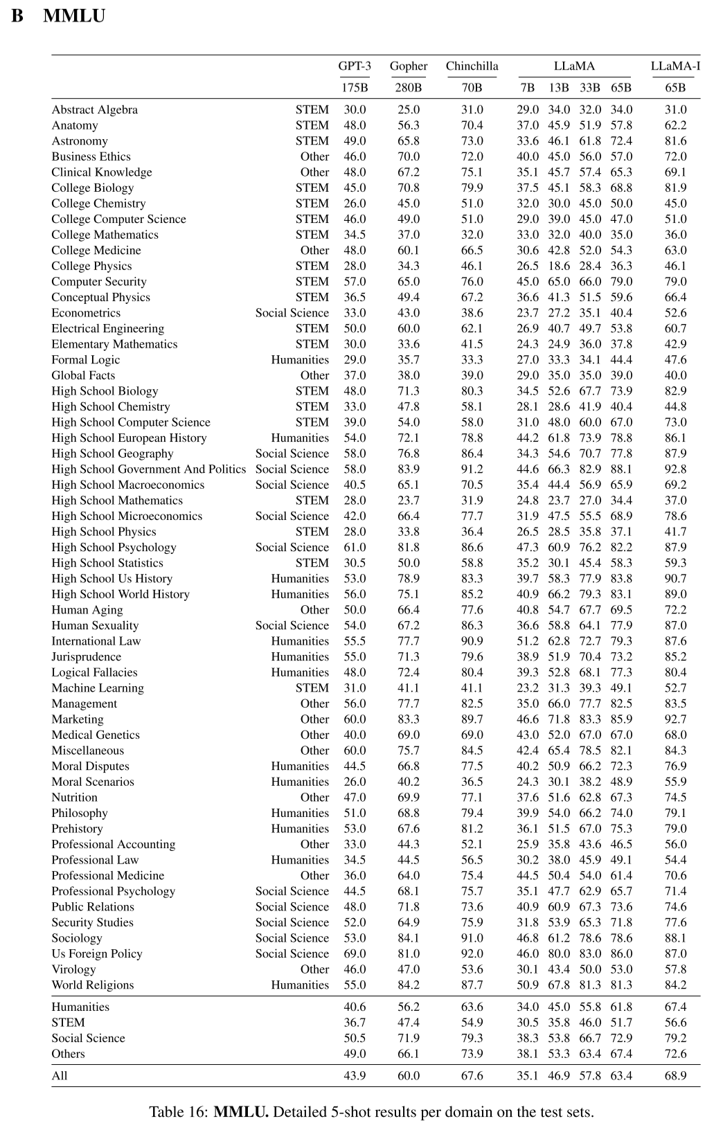 上图是Meta在论文中,主要列出的针对MMLU(大规模多任务语言理解)任务成绩,可见LLaMA的性能还是很不错的,在不少基准测试中优于GPT-3,这证明了更小的参数规模,也能产生涌现能力。