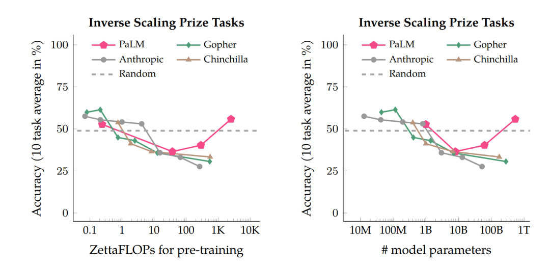 第三种表现是有些情况下,能力效果会呈现U型曲线。这类情况出现的比较少,主要是随着模型规模加大,刚开始的时候效果反而下降,但当规模到了一定程度之后,效果又开始上升。