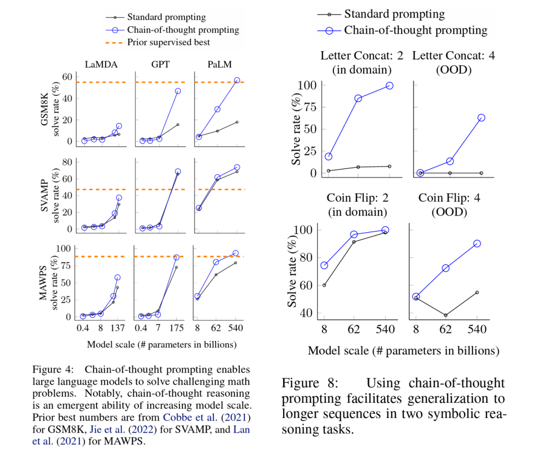 使用CoT提示,提高了大模型处理数学问题、符号推理任务的能力,出现了能力涌现现象。图片来源:Google Brain:Chain-of-Thought Prompting Elicits Reasoning in Large Language Model。