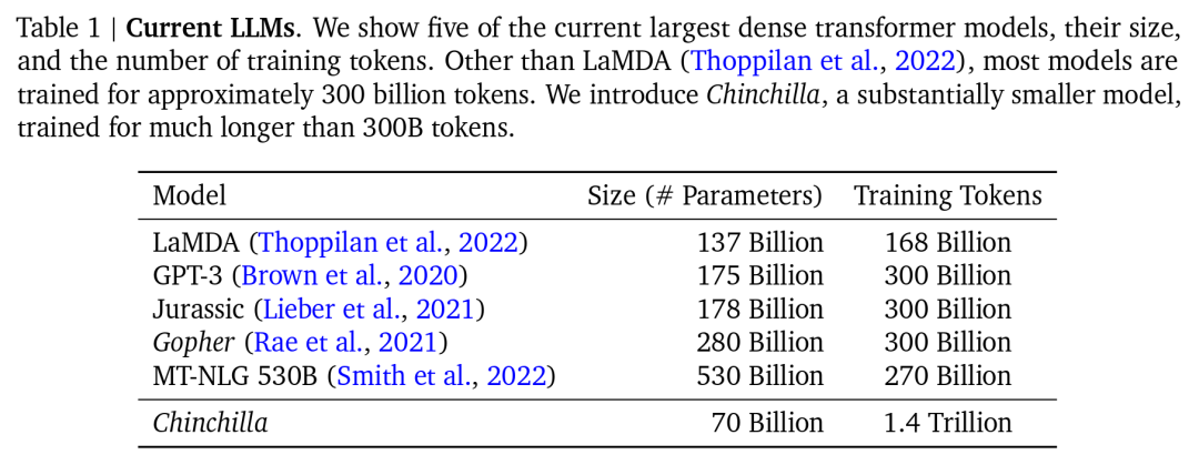 各个主流大模型的参数规模与训练数据量对比,Chinchilla参数规模最小,但训练数据量最大。图片来源:DeepMind:Training Compute-Optimal Language Models