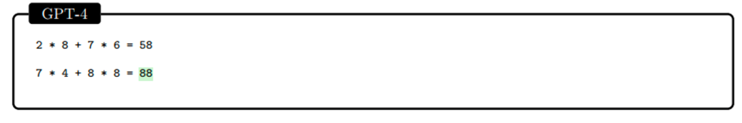 比如对于一个简单算术问题,7*4+8*8=?,GPT-4就给出了错误答案88。微软用了100个随机样本测试了这个任务,得到的准确率只有58%,但这其实是一个小学生都可以解决的简单算术问题。如果把数字变大,到99-199 之间,准确率降至零。