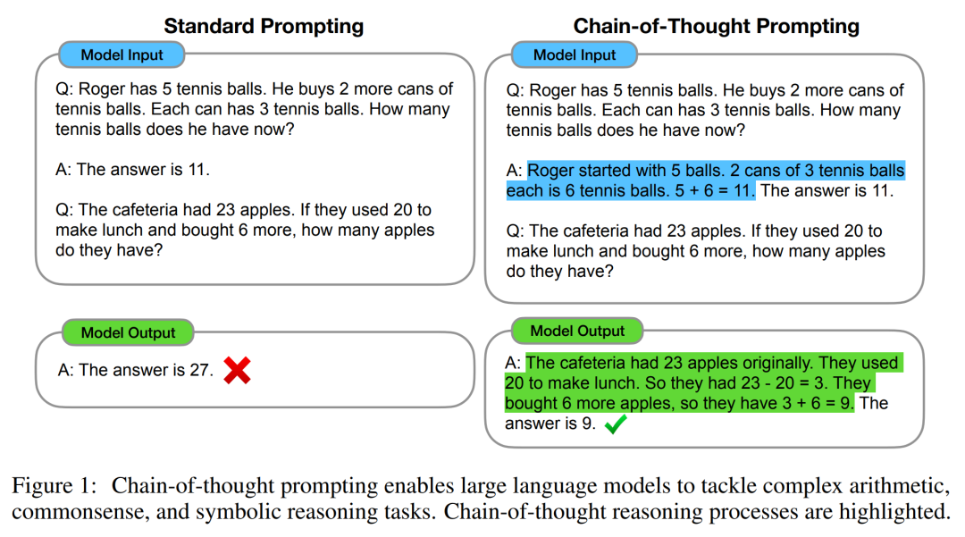 最早系统性提出CoT做法的,是Google Brain团队,9位作者在论文Chain of thought prompting elicits reasoning in large language models中系统性阐述了CoT。人工写的详细推理过程,就是上图中蓝色文字部分。