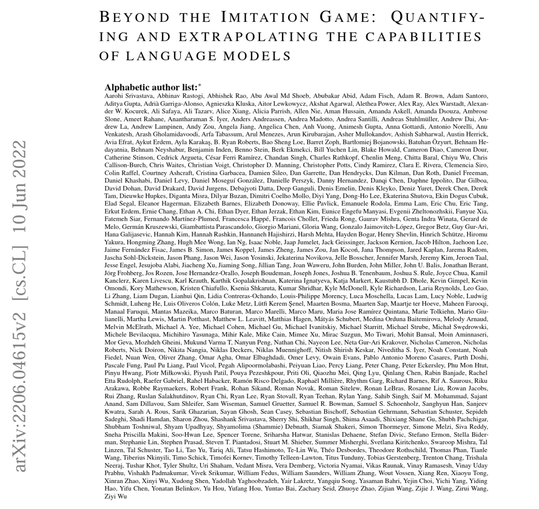 Beyond The Imitation Game: Quantifying And Extrapolating The Capabilities Of Language Models论文首页,密密麻麻地列举了132个机构的442位作者,感谢这些在人类前沿领域不断探索的人们。