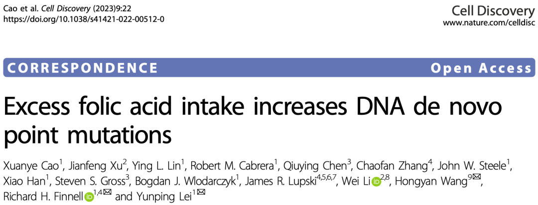 [4].Cao X, Xu J, Lin YL, et al. Excess folic acid intake increases DNA de novo point mutations. Cell Discov. 2023;9(1):22. doi:10.1038/s41421-022-00512-0