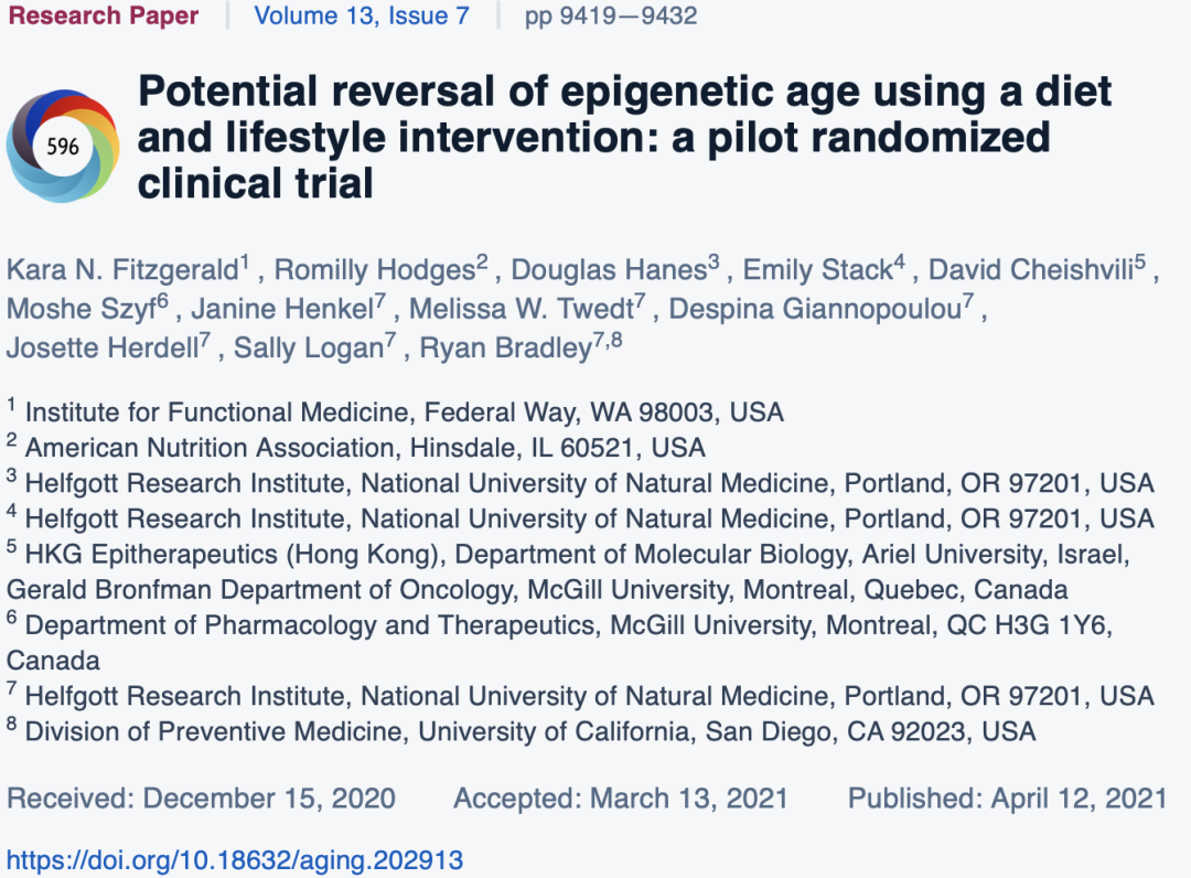 [2]Fitzgerald KN, Hodges R, Hanes D, Stack E, Cheishvili D, Szyf M, Henkel J, Twedt MW, Giannopoulou D, Herdell J, Logan S, Bradley R. Potential reversal of epigenetic age using a diet and lifestyle intervention: a pilot randomized clinical trial. Aging (Albany NY). 2021 Apr 12;13(7):9419-9432. doi: 10.18632/aging.202913. Epub 2021 Apr 12. Erratum in: Aging (Albany NY). 2022 Jul 27;14(14):5959. PMID: 33844651; PMCID: PMC8064200.