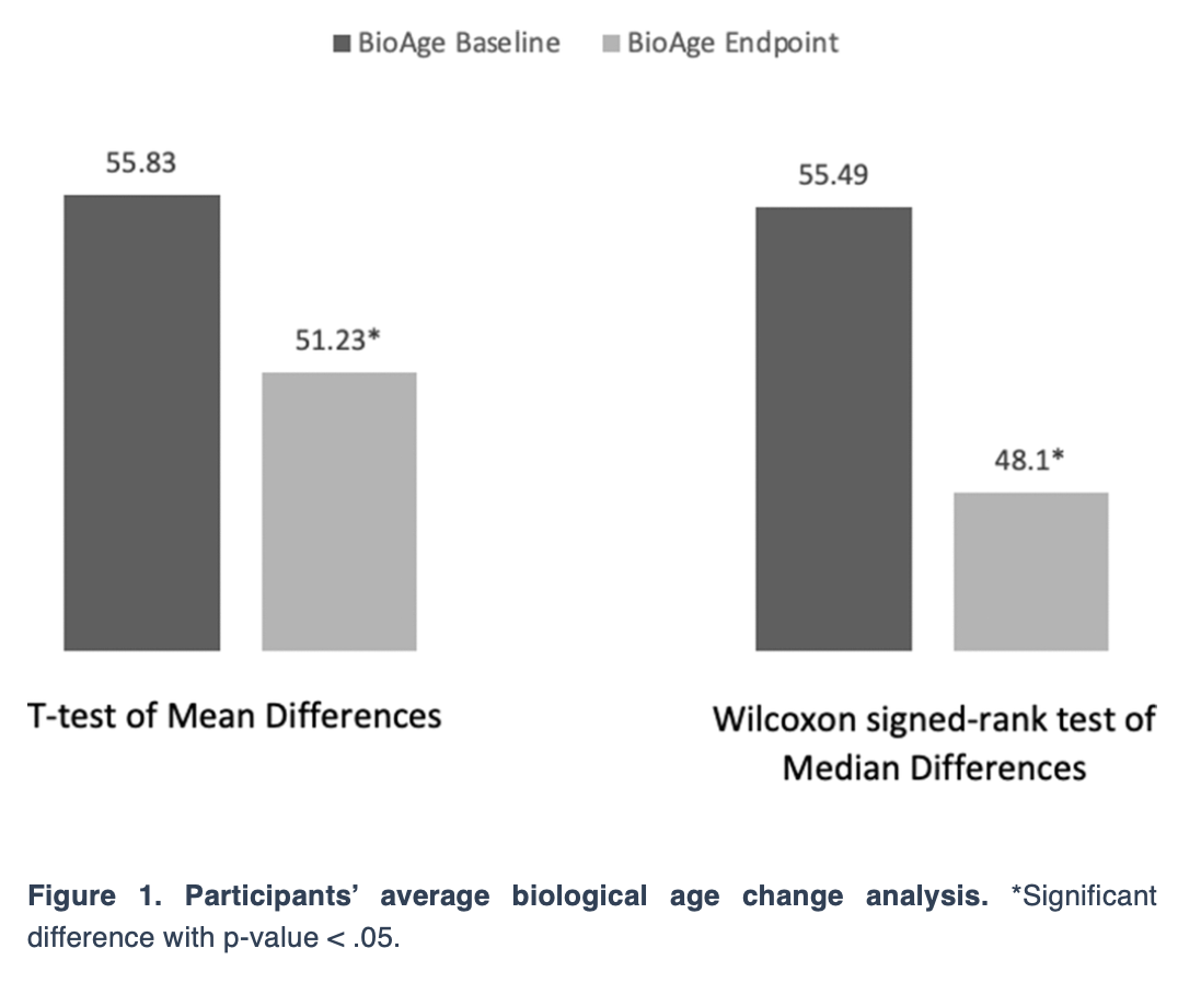此外,在基线和8周结束时,研究者还收集了参与者的血液样本,使用Horvath DNAmAge时钟来评估DNA甲基化和生物年龄。DNA甲基化年龄(即生物年龄)和实际年龄之间的差异,可用作评估衰老的生物标志物。