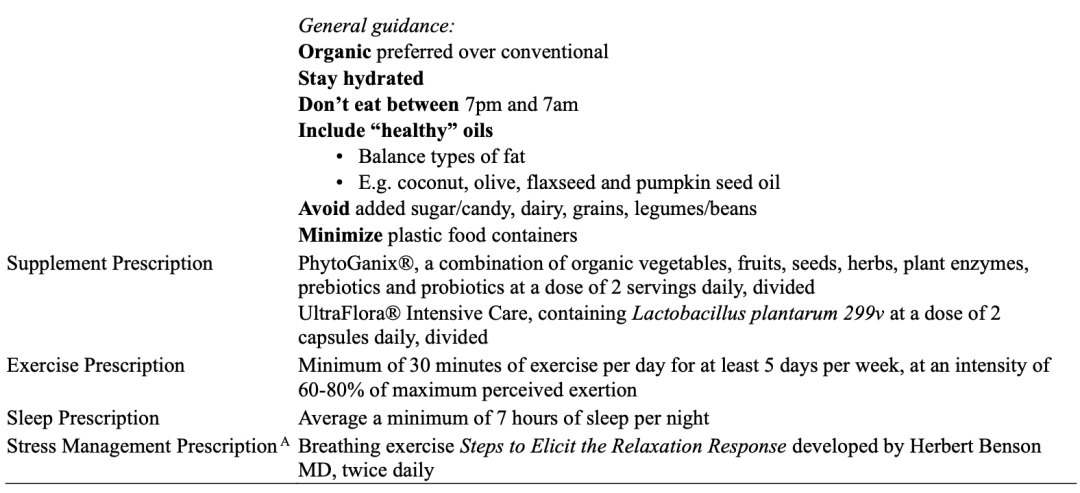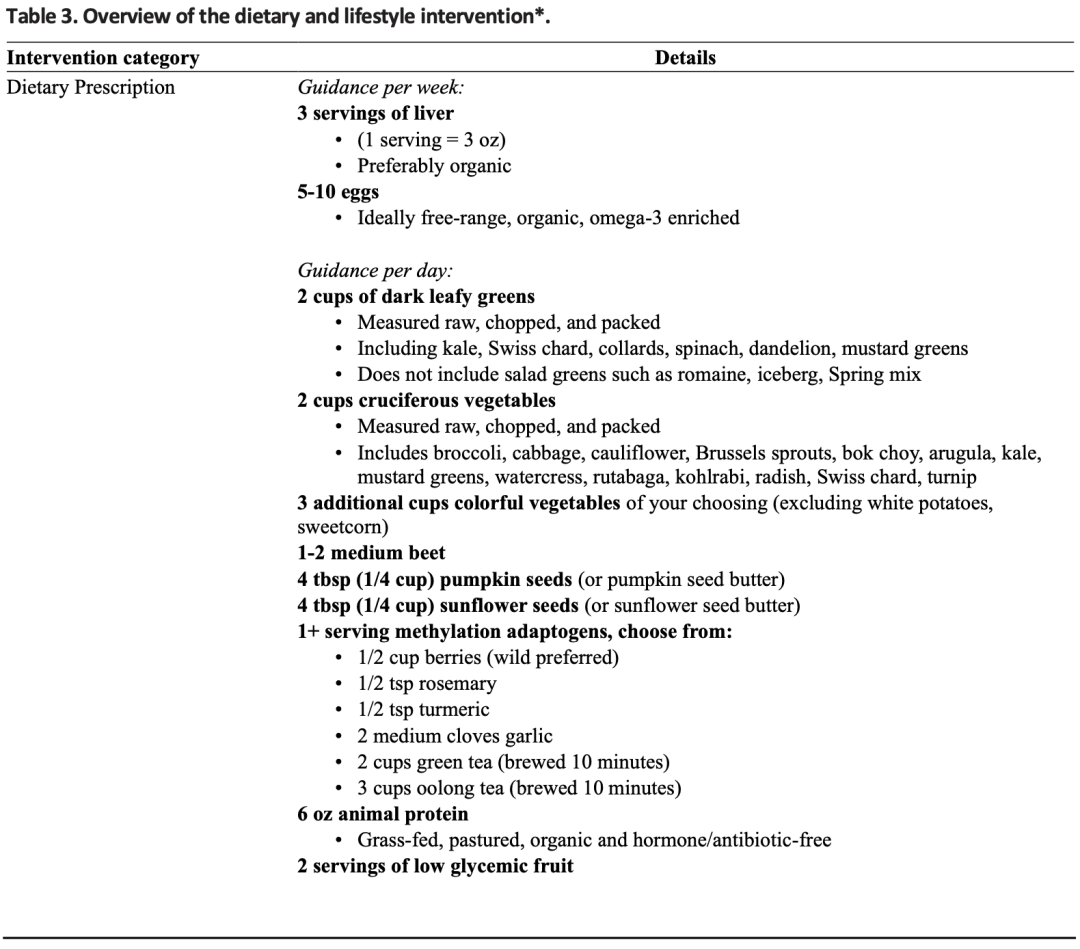 饮食干预——限制简单的碳水化合物,饮食以植物为中心。但需要保证充足的动物蛋白,比如每周5-10个鸡蛋,每天170g动物蛋白,每周3份85g肝脏。同时,参与者被要求每天在12小时内吃完所有的食物,以及一天保证8杯水。