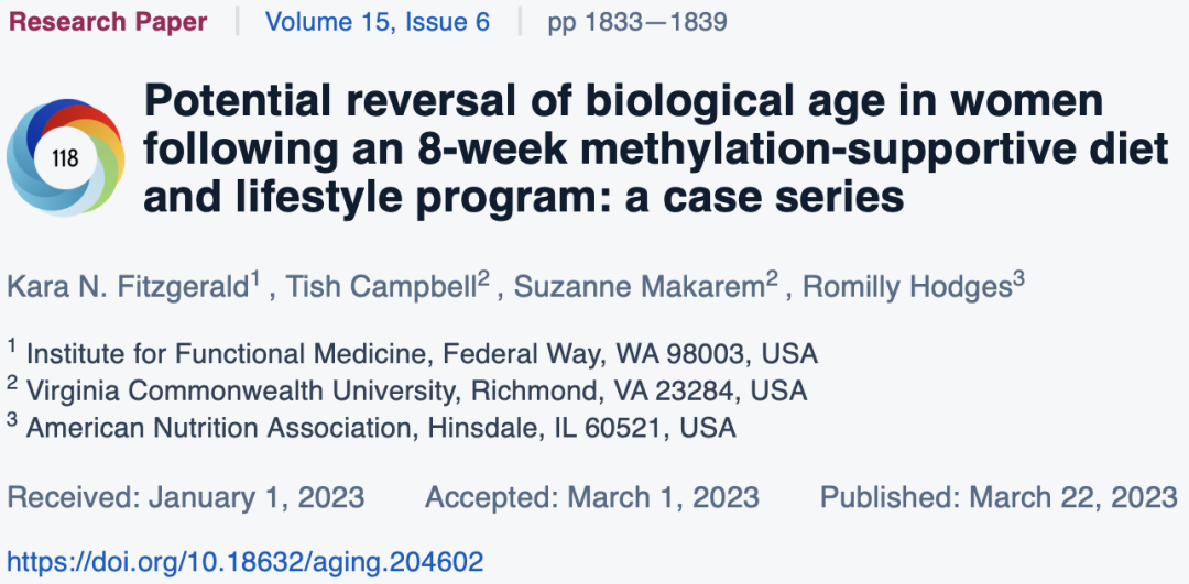 [1]Fitzgerald KN, Campbell T, Makarem S, Hodges R. Potential reversal of biological age in women following an 8-week methylation-supportive diet and lifestyle program: a case series. Aging (Albany NY). 2023 Mar 22; 15:1833-1839 . https://doi.org/10.18632/aging.204602