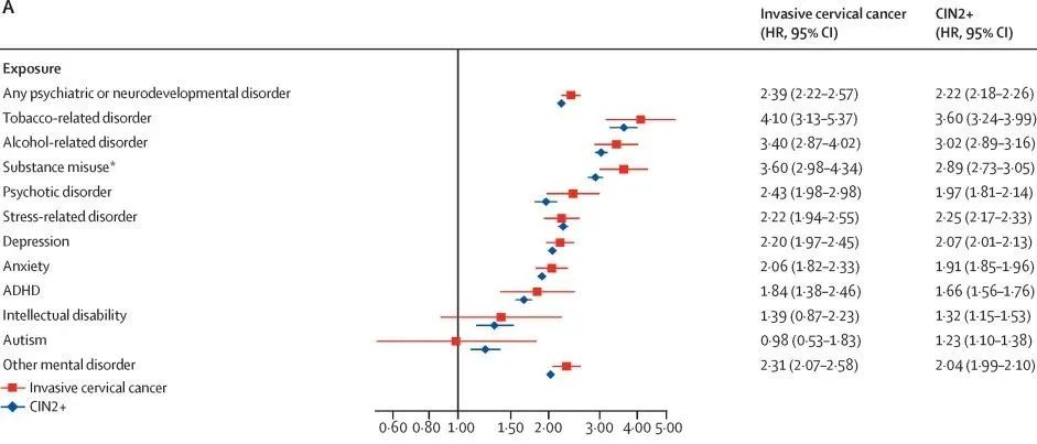 这些患精神或神经发育障碍的参与者与未患此类疾病的相比,浸润性宫颈癌风险增加139%(HR 2.39,p<0.0001),CIN2+风险增加122%(HR 2.22,p<0.0001)。几乎所有类型的障碍都与风险增加有关,其中物质滥用(烟草使用障碍、酒精使用障碍和其他物质滥用)关联最强,烟草使用障碍者风险增加高达310%和260%。