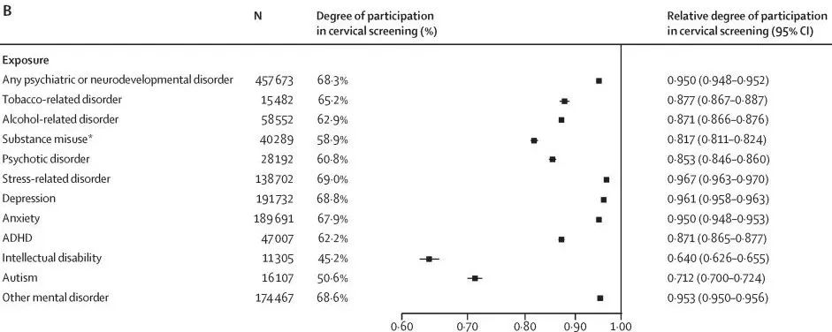 不同患精神或神经发育障碍的参与者宫颈检查参与程度降低情况