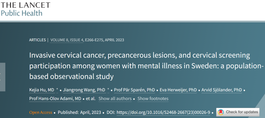 [2] Hu K, Wang J, Sparén P, et al. Invasive cervical cancer, precancerous lesions, and cervical screening participation among women with mental illness in Sweden: a population-based observational study[J]. The Lancet Public Health, 2023, 8(4): e266-e275.