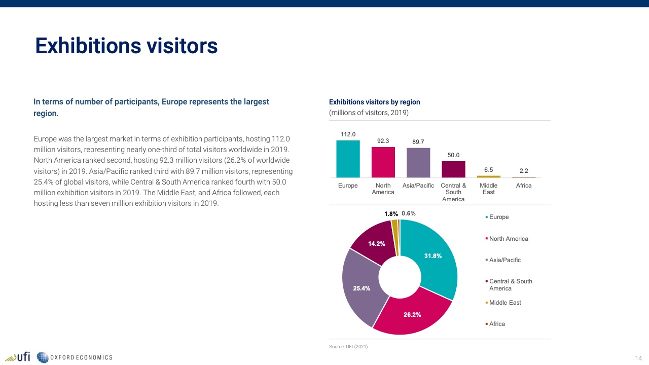 根据全球约 480 万参展商和 1256 亿欧元(1407 亿美元)的直接支出,展览会在全球范围内为每位参展商带来约 26400 欧元(29600 美元)的直接支出。