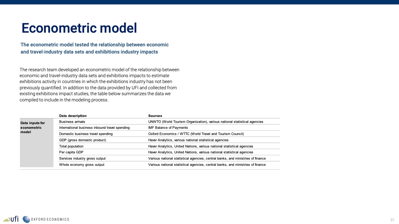 开发了经济和旅游业数据集与展览业影响之间关系的计量经济学模型,以估计展览业以前未被量化的国家/地区的展览活动;