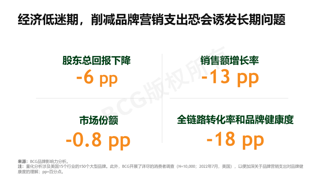品牌营销的预算该不该削减?BCG 最新研究显示:经济下行期间,缩减品牌营销相关投入将引发多方面的问题,如市场份额下降、销售额滑坡、股东回报减少、品牌重建的长期成本上升等,反而得不偿失(参阅下图)。在经济下行叠加通胀高企的背景下,减少对品牌营销的投入也无法在短期内显著改善企业的盈利水平。