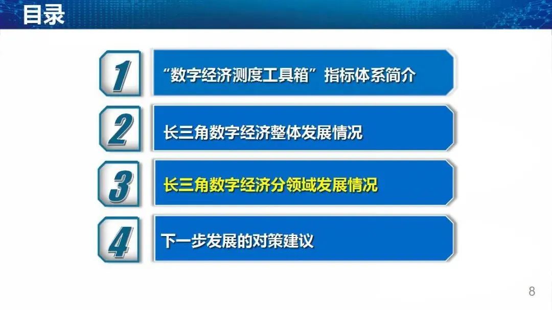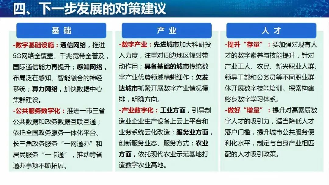 《报告》建议,长三角城市可以从建设泛在互联的数字基础设施、推动产业数字化转型、加大数字产业化扶持力度、持续完善公共服务数字化水平、优化提升数字营商环境等方面继续发力,深挖数字经济发展潜能。