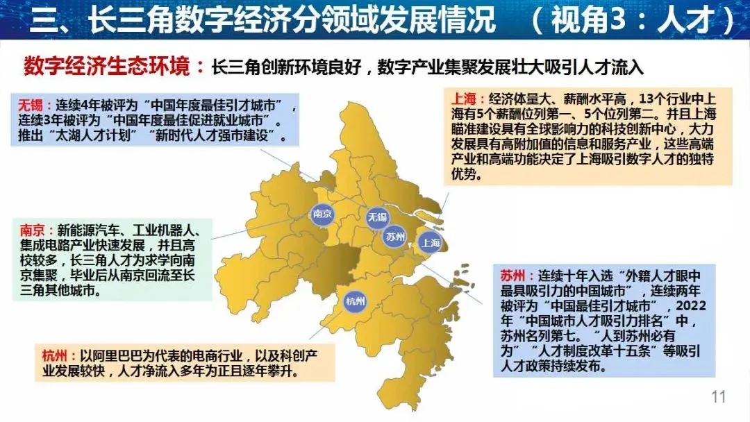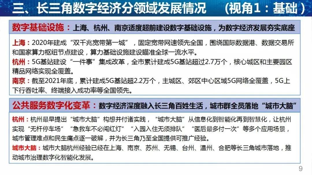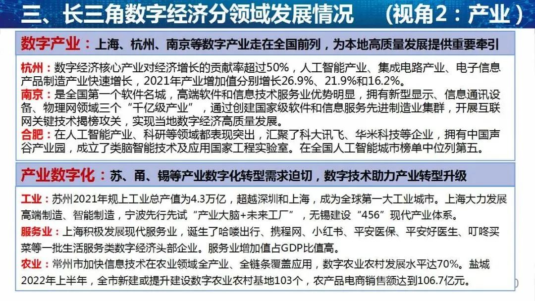 《报告》显示,长三角一市三省以数字经济带动整体经济社会快速发展的态势已经形成,经过多年发展,以上海为区域中心城市,以南京、杭州、合肥等省会城市,以及苏州、无锡、常州、宁波等经济强市作为副中心的“一主多副”结构逐渐发挥辐射带动作用,引领长三角城市群数字经济发展水平逐年稳步提升。数字基础设施方面,沪杭宁适度超前建设数字基础设施,为数字经济发展夯实底座;数字产业化方面,上海、杭州、南京、苏州等城市数字产业走在全国前列,为本地高质量发展提供重要牵引;产业数字化方面,苏州、宁波、无锡等城市产业数字化转型需求迫切,数字技术先发优势助力产业转型升级;数字化公共服务方面,数字经济深度融入长三角百姓生活,城市群全员落地“城市大脑”;数字经济生态环境方面,长三角数字经济创新环境良好,数字产业集聚发展吸引高端人才不断汇入。