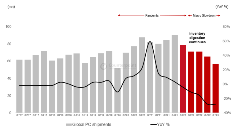 近日消息,根据市场调查机构 Counterpoint Research 公布的最新报告,2023 年第 1 季度全球个人电脑出货量为 5670 万台,同比下降了 28%。这也是过去 10 年来第 1 季度出货量最低的年份。