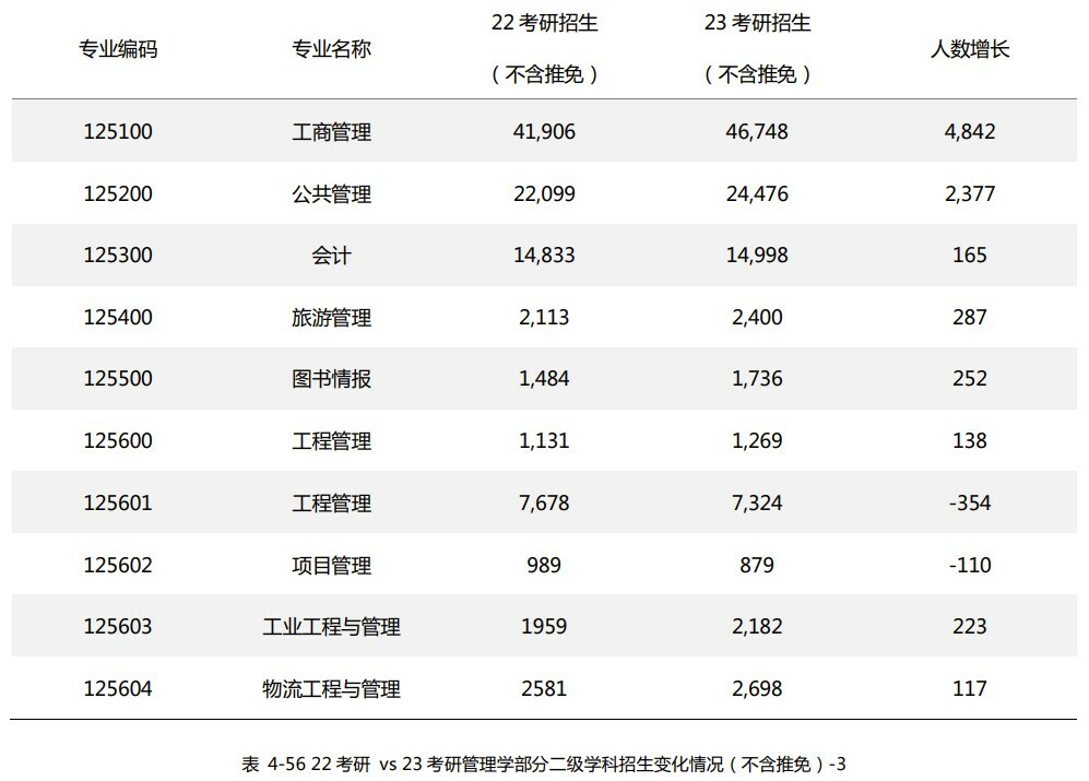 一方面,作为历年来报考“大户”的管理学,招生名额仍在持续提升,为考生提供着更多机会。《报告》指出,2023年管理学招生名额相较2022年增加7776 人,占到了2023年考研总招生人数增量(10245人)的75.9%,远高于其他学科门类。其中,工商管理和公共管理两大专业相较2022年,分别增长4842人与2377人,占管理学专业型硕士增长总人数的超90%。