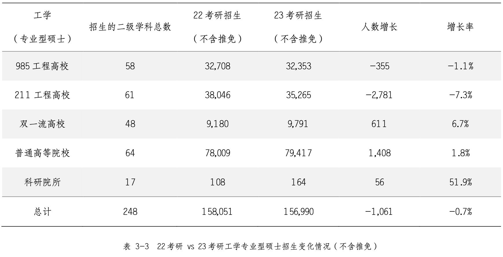 《报告》显示,2023年考研理学门类学术型硕士,双一流高校(指世界一流大学建设高校和世界一流学科建设高校名单中,除去39所985工程高校、116所211工程高校的剩余高校)共减少263个招生名额;而普通高校则增加了950个招生名额。工学门类方面,2023年全国的普通高校总计64个二级学科(即专业)开放工学专业型硕士招生,虽仅占招生单位该门类全部二级学科总数量的25%,却提供了79417个招生名额,占据了工学专业型硕士总体招生的50.6%。