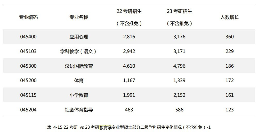 类似的学科也包括教育学。《报告》显示,2023年教育学学术型硕士招生人数为9258人,专业型硕士招生人数40115人。虽然,2023年考研中教育学门类的招生名额共减少了527人,但心理学、体育学、汉语国际教育、应用心理、学科教学(语文)等专业,招生名额相较2022年均有较大提升。