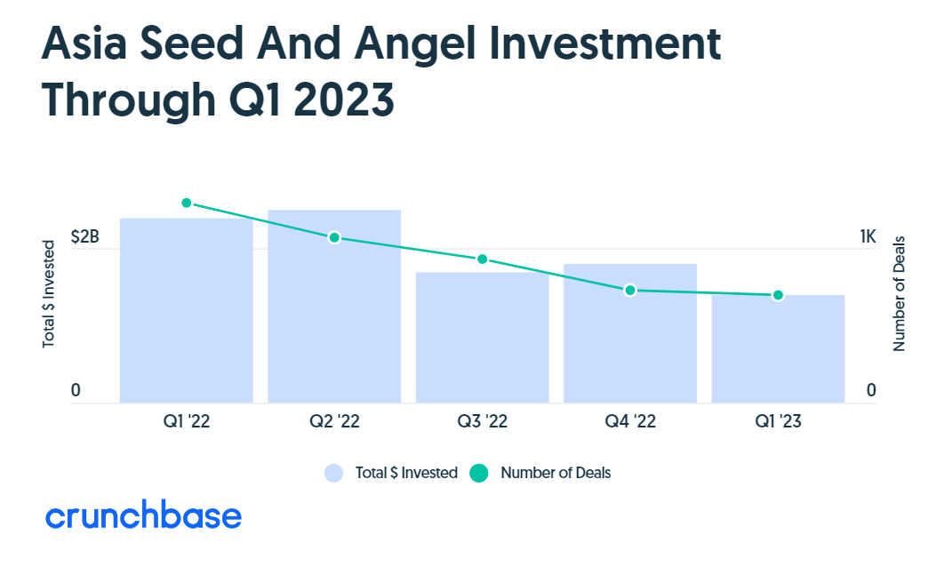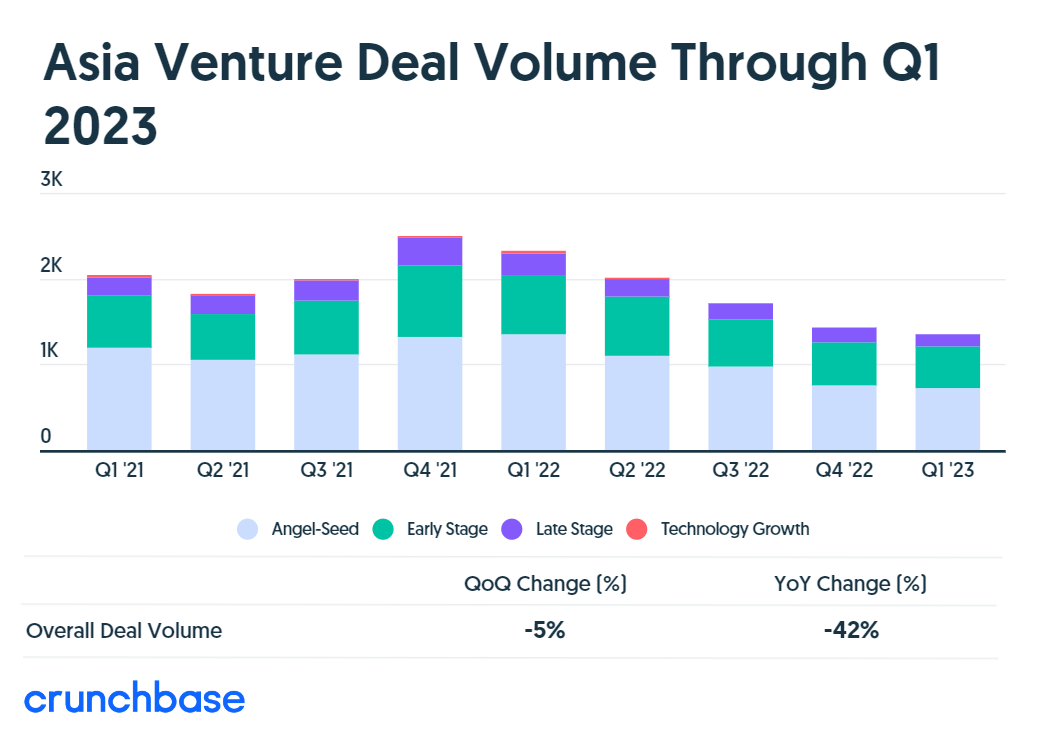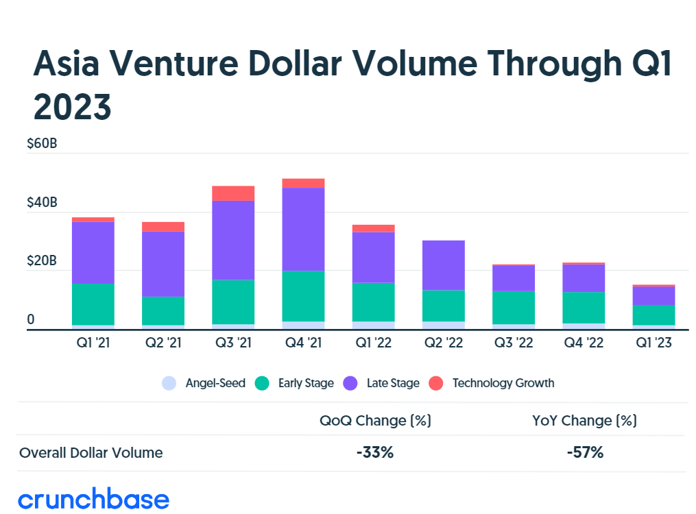 亚洲的风险投资在 2023 年第一季度开局不利,环比下降 33%,同比下降 57%。