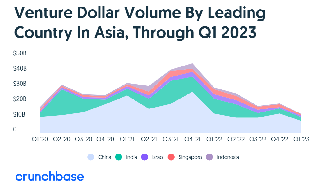Crunchbase 的数据显示,该地区的风险投资总额降至 152 亿美元。 一年前,亚洲第一季度的融资额达到 355 亿美元,2022 年第四季度为 224 亿美元。