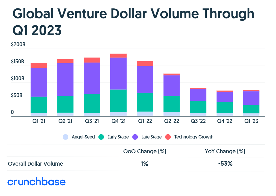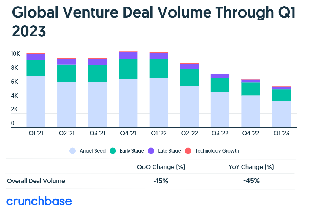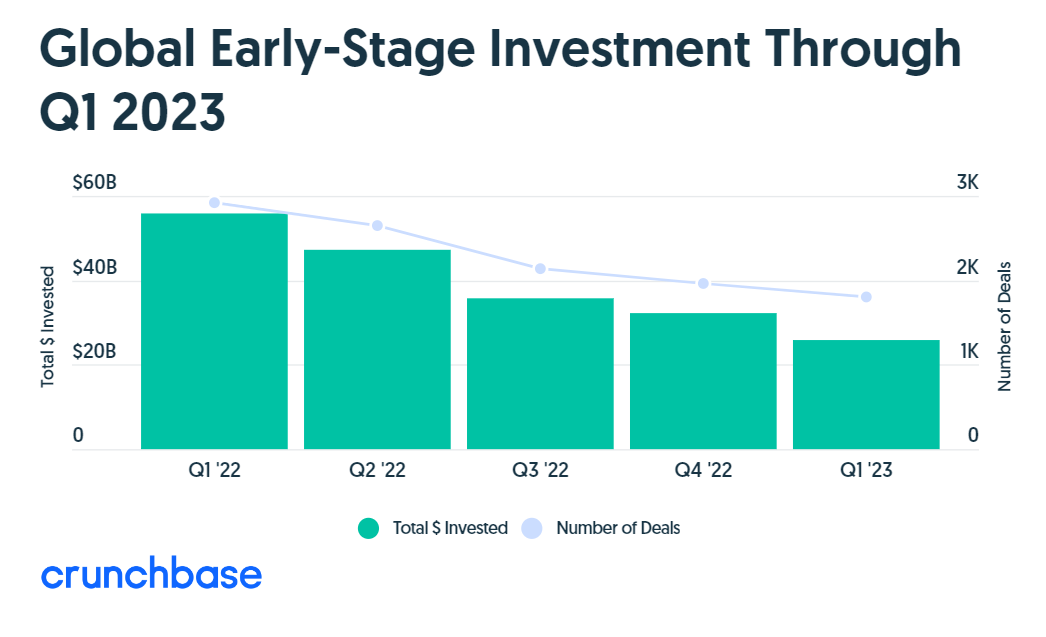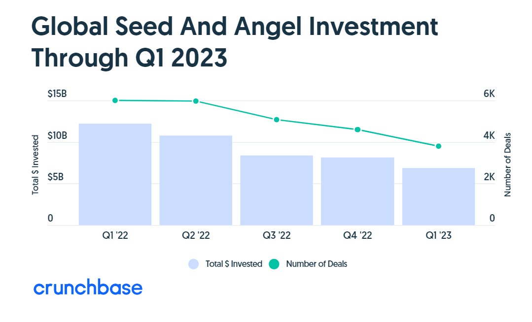 2023 年第一季度,种子投资总额为 69 亿美元,同比下降 44%,这表明即使在最早的融资阶段,投资者也在撤退。