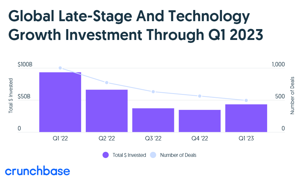 后期投资总额为 430 亿美元,较 2022 年第一季度(930 亿美元)大幅下降,但高于第四季度的 340 亿美元。