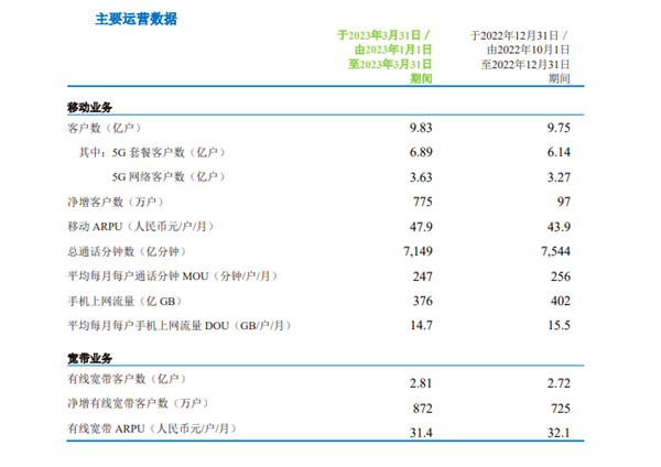 业绩显示,第一季度,移动客户数为9.83亿户,其中5G套餐客户数为6.89亿户,有线宽带客户数为2.81亿户。