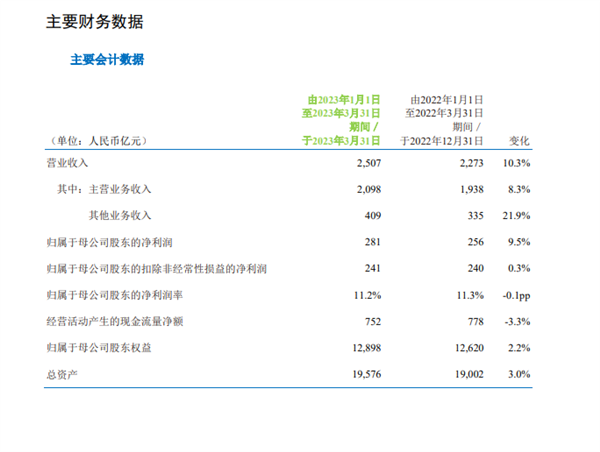 近日消息,中国移动发布2023年第一季度业绩,第一季度,公司营运收入为人民币2507亿元,同比增长10.3%;其中,通信服务收入为人民币2,098亿元,同比增长8.3%。