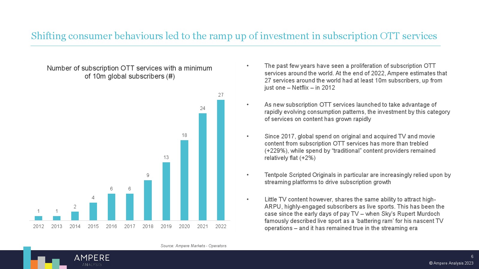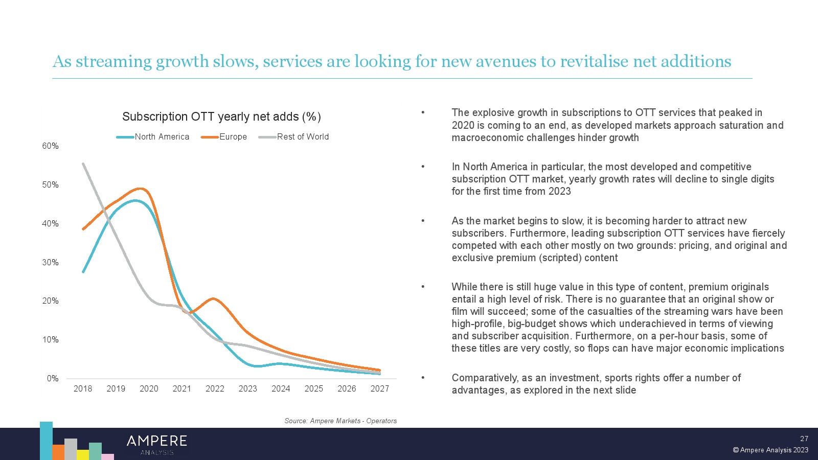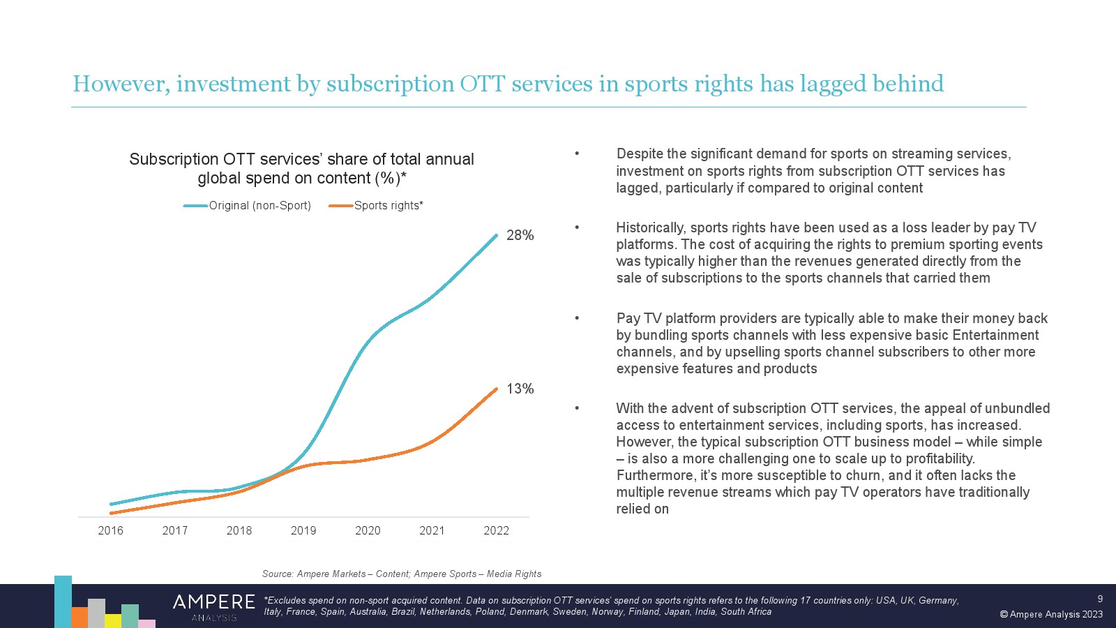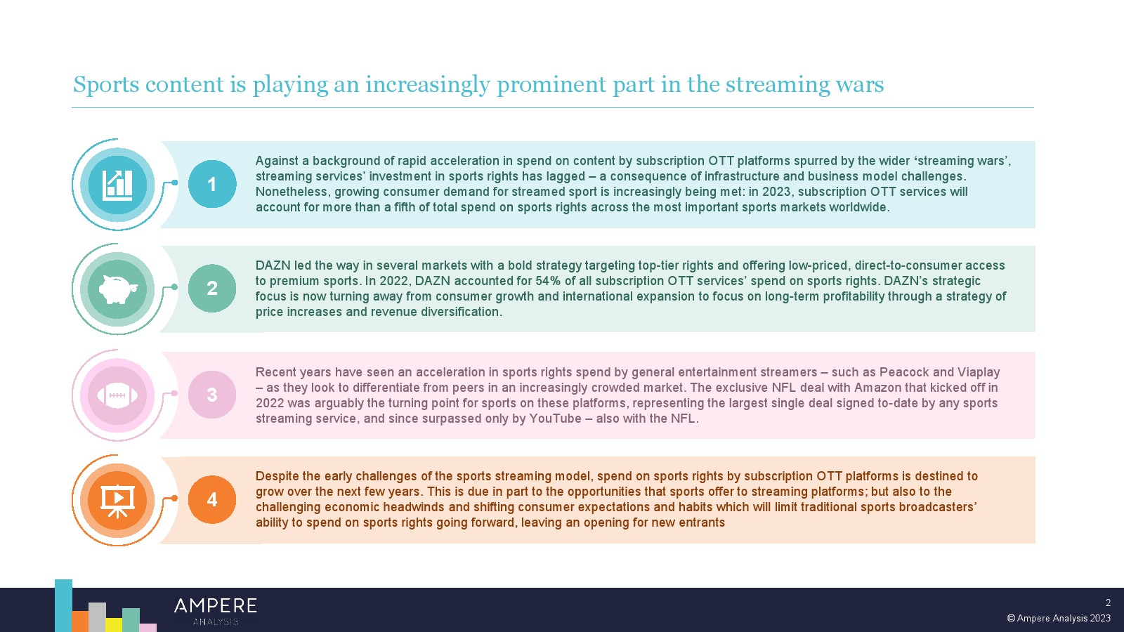 尽管体育流媒体模式在早期面临挑战,但订阅 OTT 平台在体育转播权上的支出在未来几年注定会增长。这在一定程度上是由于体育为流媒体平台提供的机会。但也面临着具有挑战性的经济逆风和不断变化的消费者期望和习惯,这将限制传统体育广播公司未来在体育转播权上的支出能力,从而为新进入者留下机会。