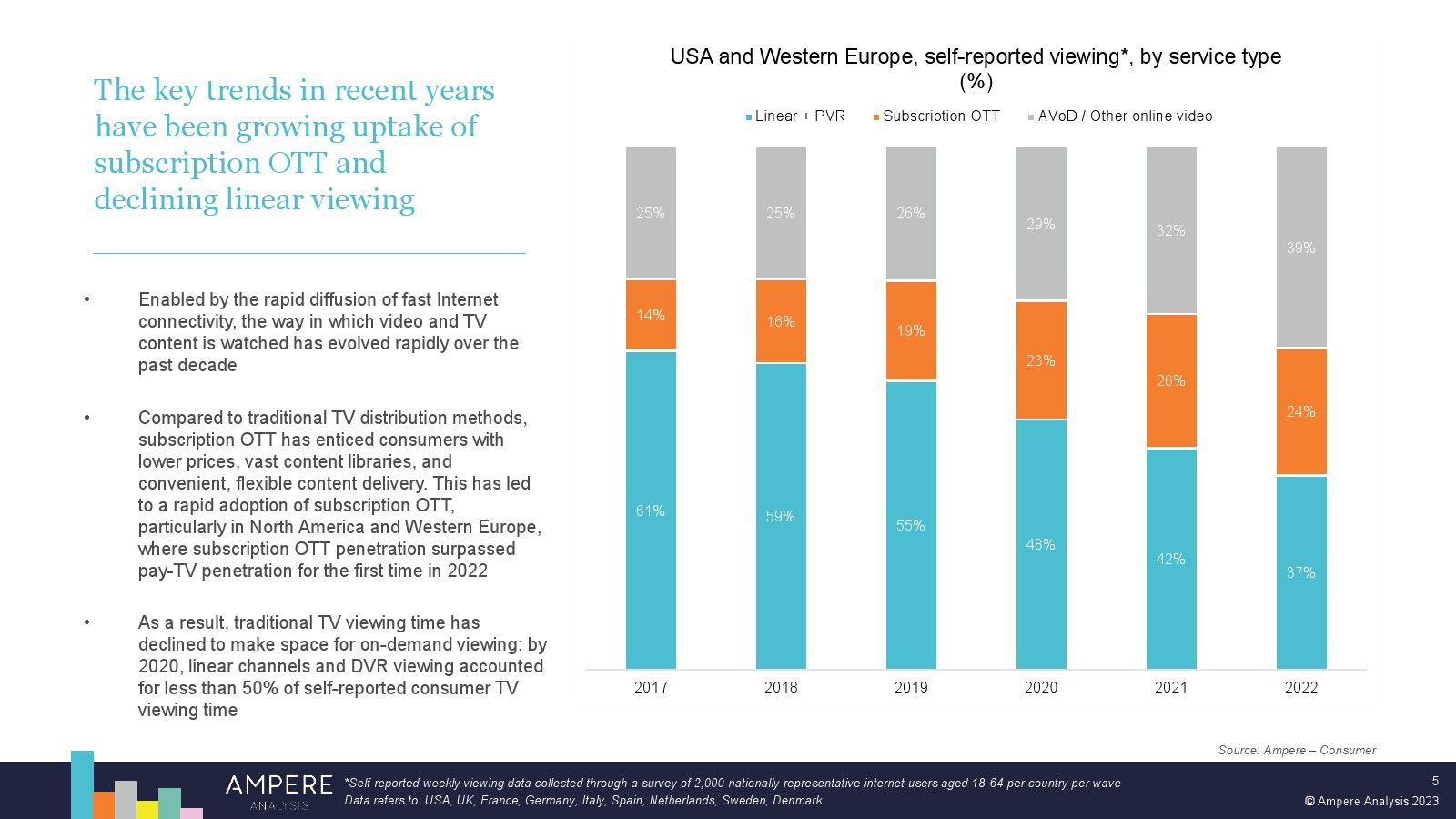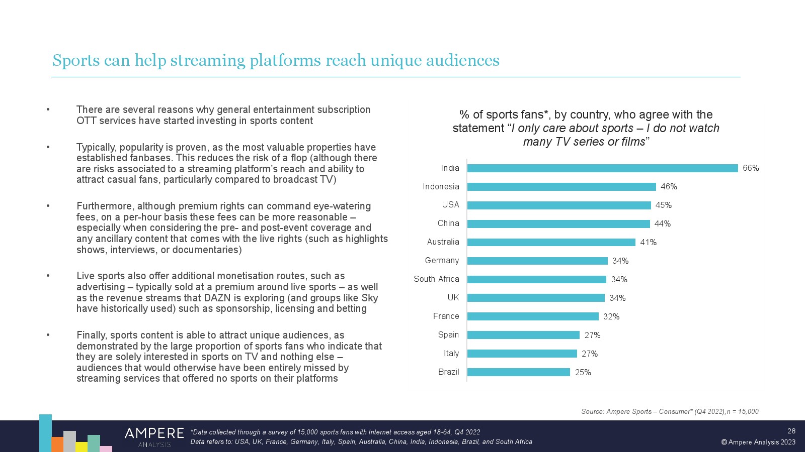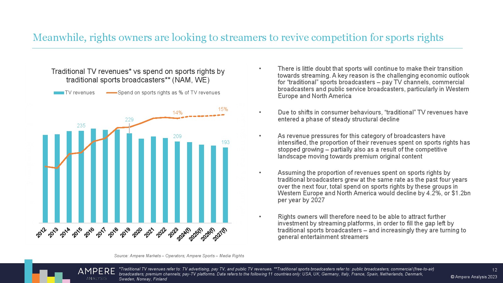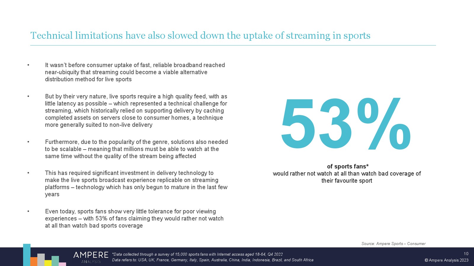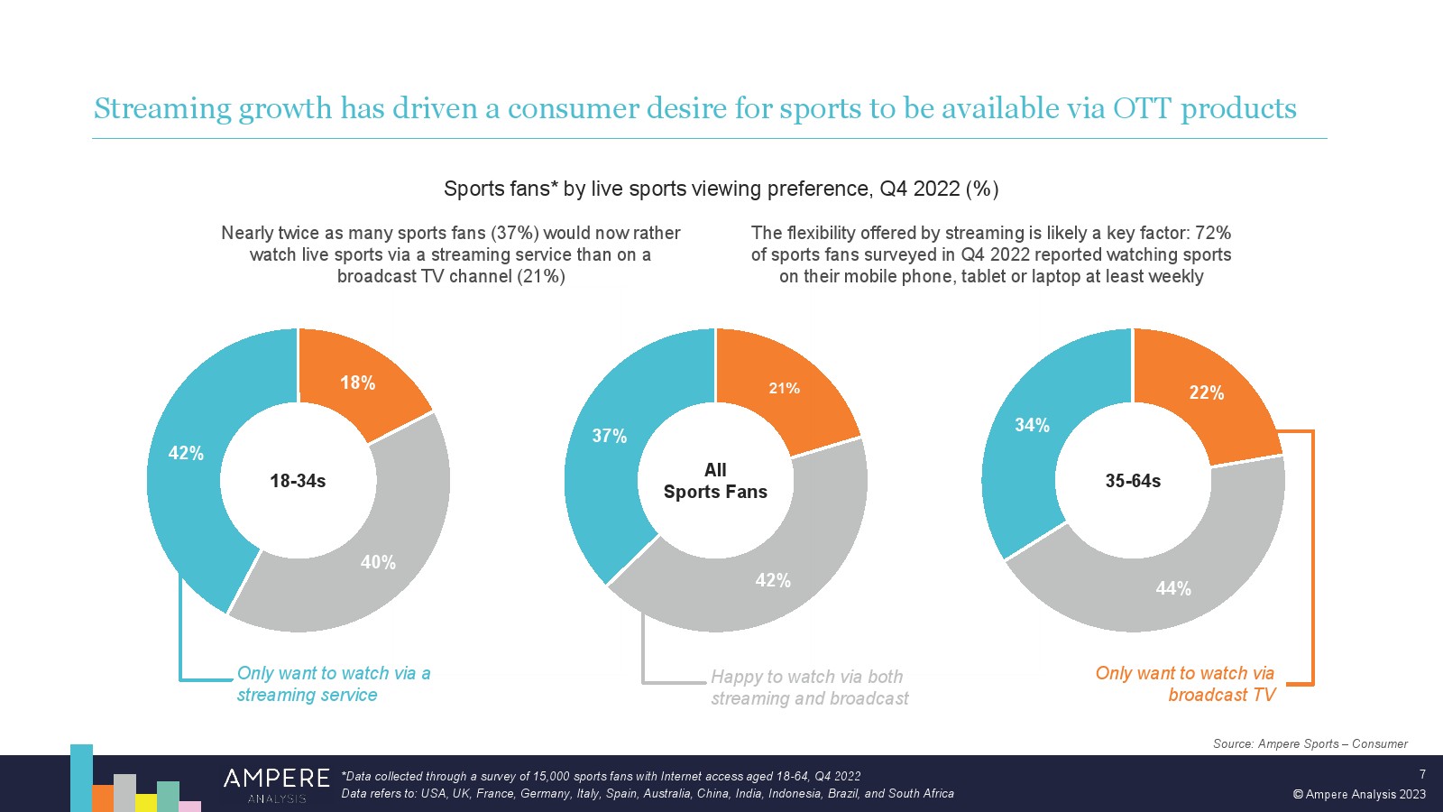 尽管体育流媒体模式在早期面临挑战,但订阅 OTT 平台在体育转播权上的支出在未来几年注定会增长。这在一定程度上是由于体育为流媒体平台提供的机会。但也面临着具有挑战性的经济逆风和不断变化的消费者期望和习惯,这将限制传统体育广播公司未来在体育转播权上的支出能力,从而为新进入者留下机会。