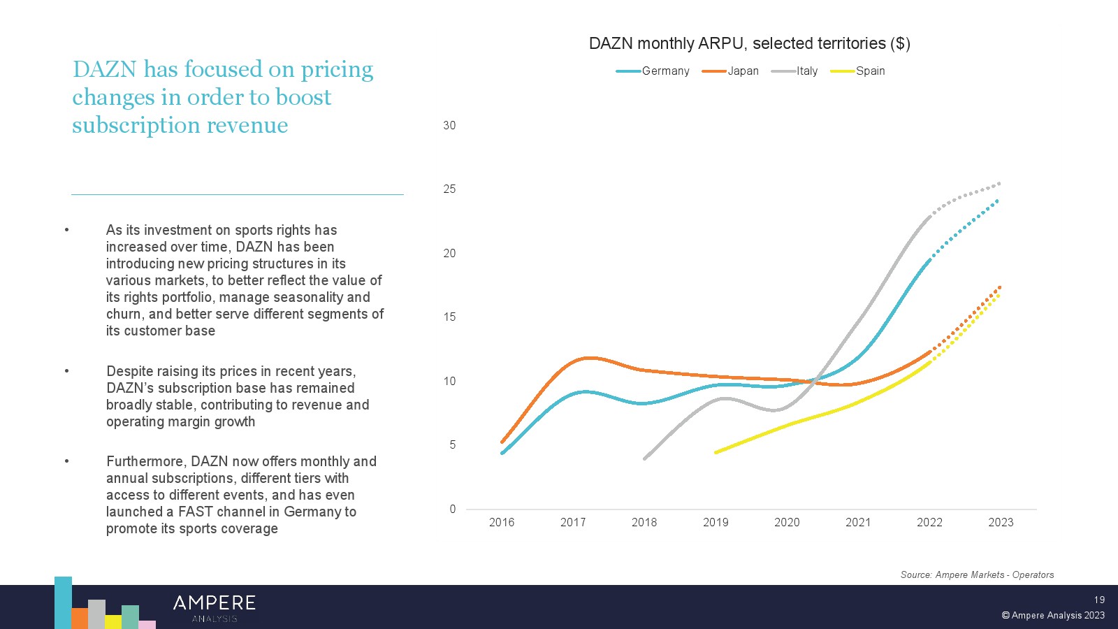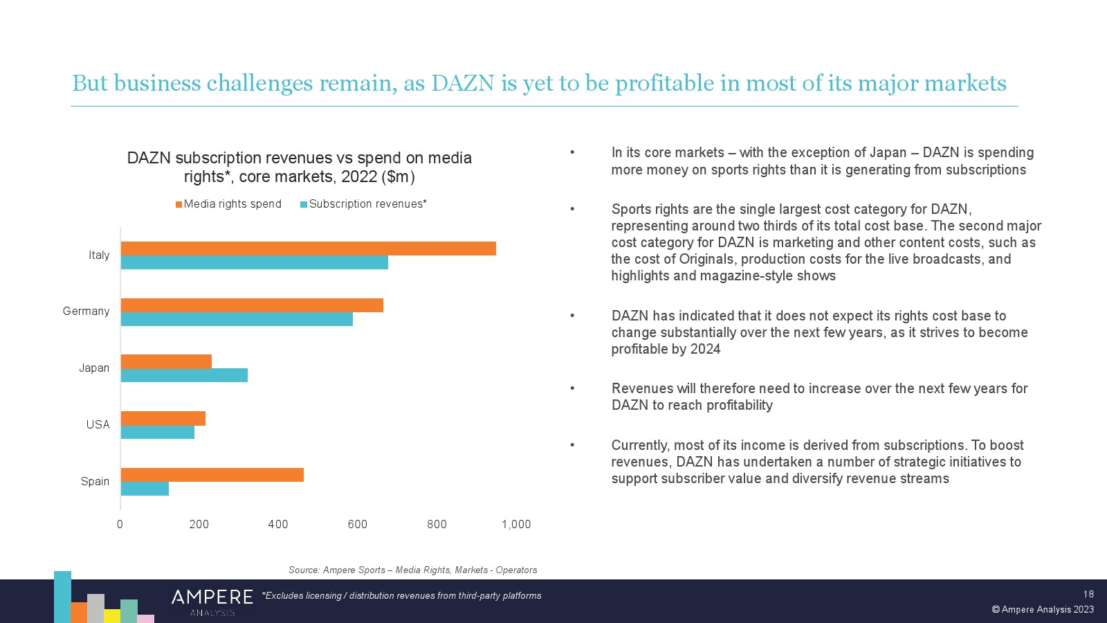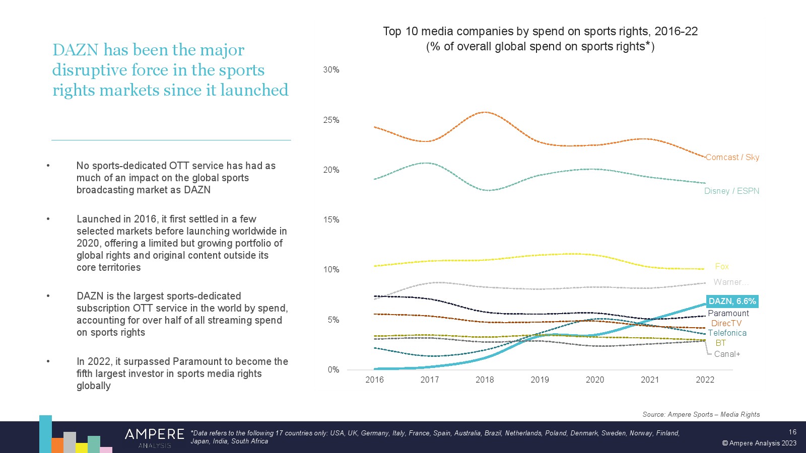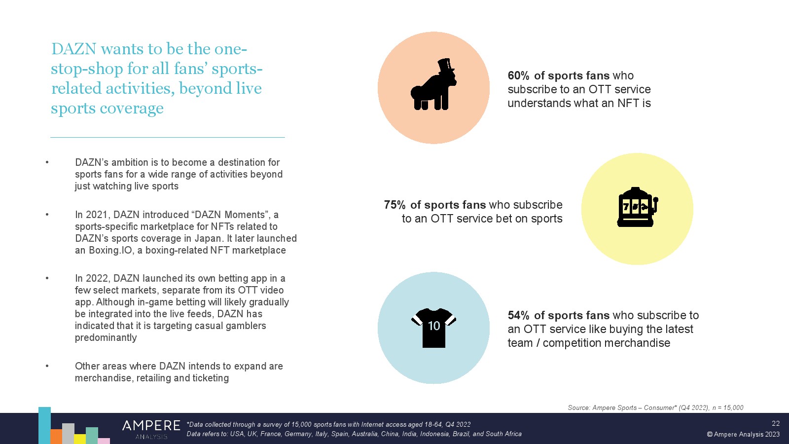 DAZN 以大胆的战略瞄准顶级版权并提供低价、直接面向消费者的优质体育赛事,在多个市场处于领先地位。2022 年,DAZN 占所有订阅 OTT 服务体育转播权支出的 54%。 DAZN 的战略重点现在正从消费者增长和国际扩张转向通过价格上涨和收入多元化战略关注长期盈利能力。