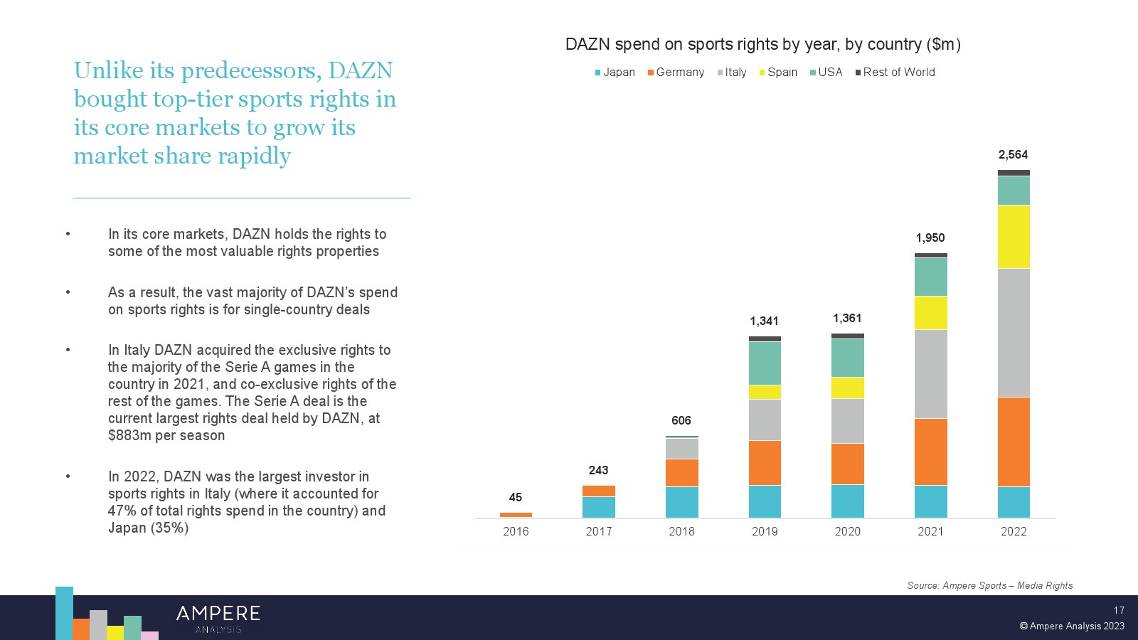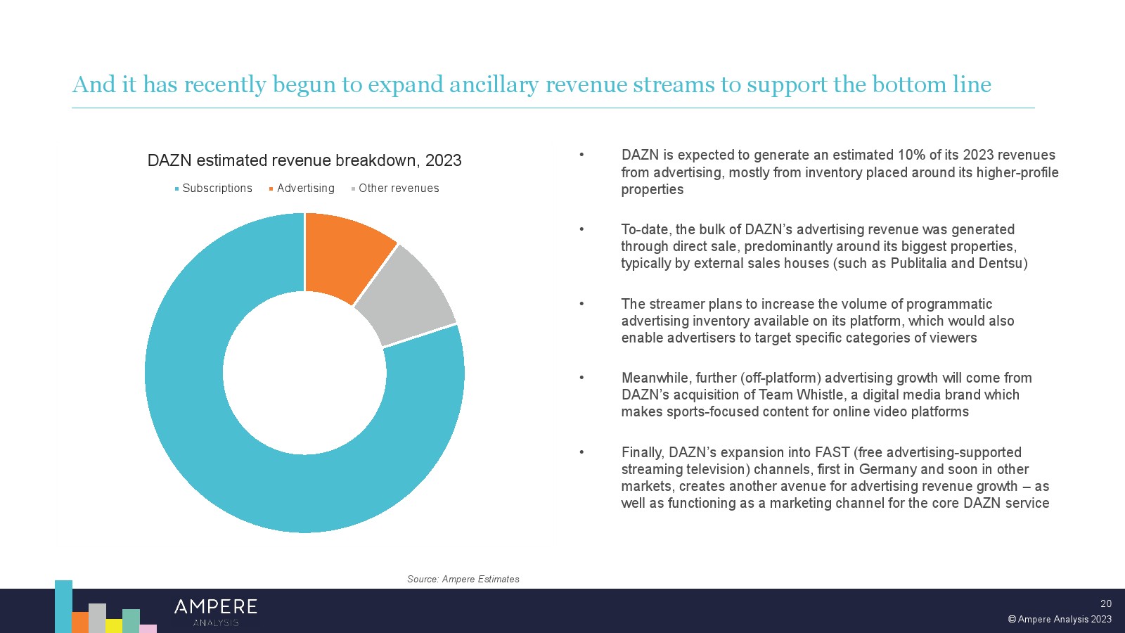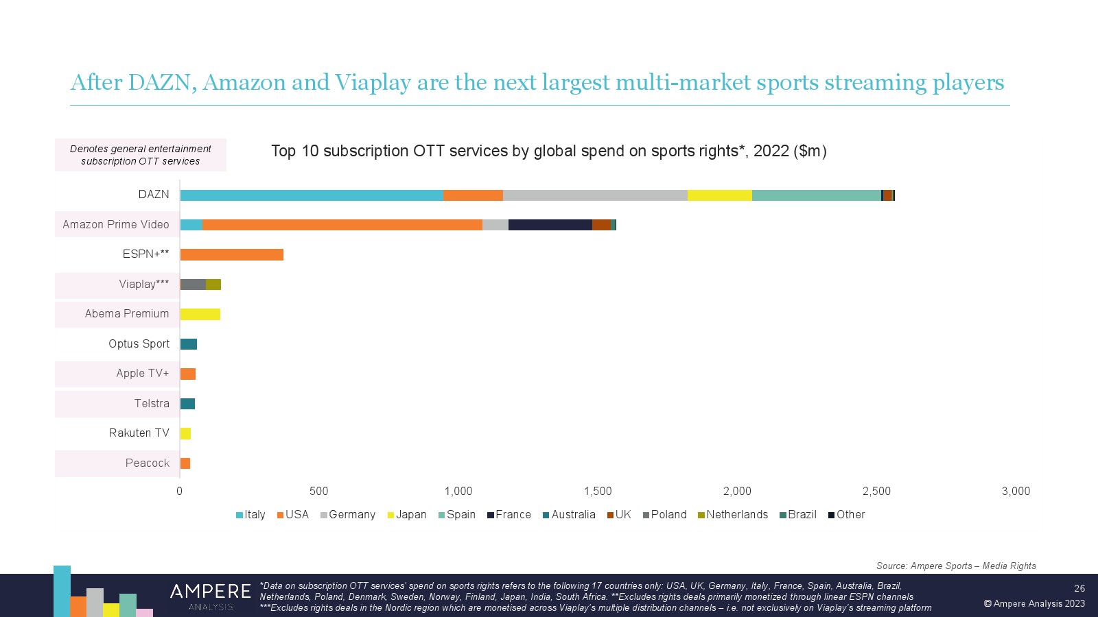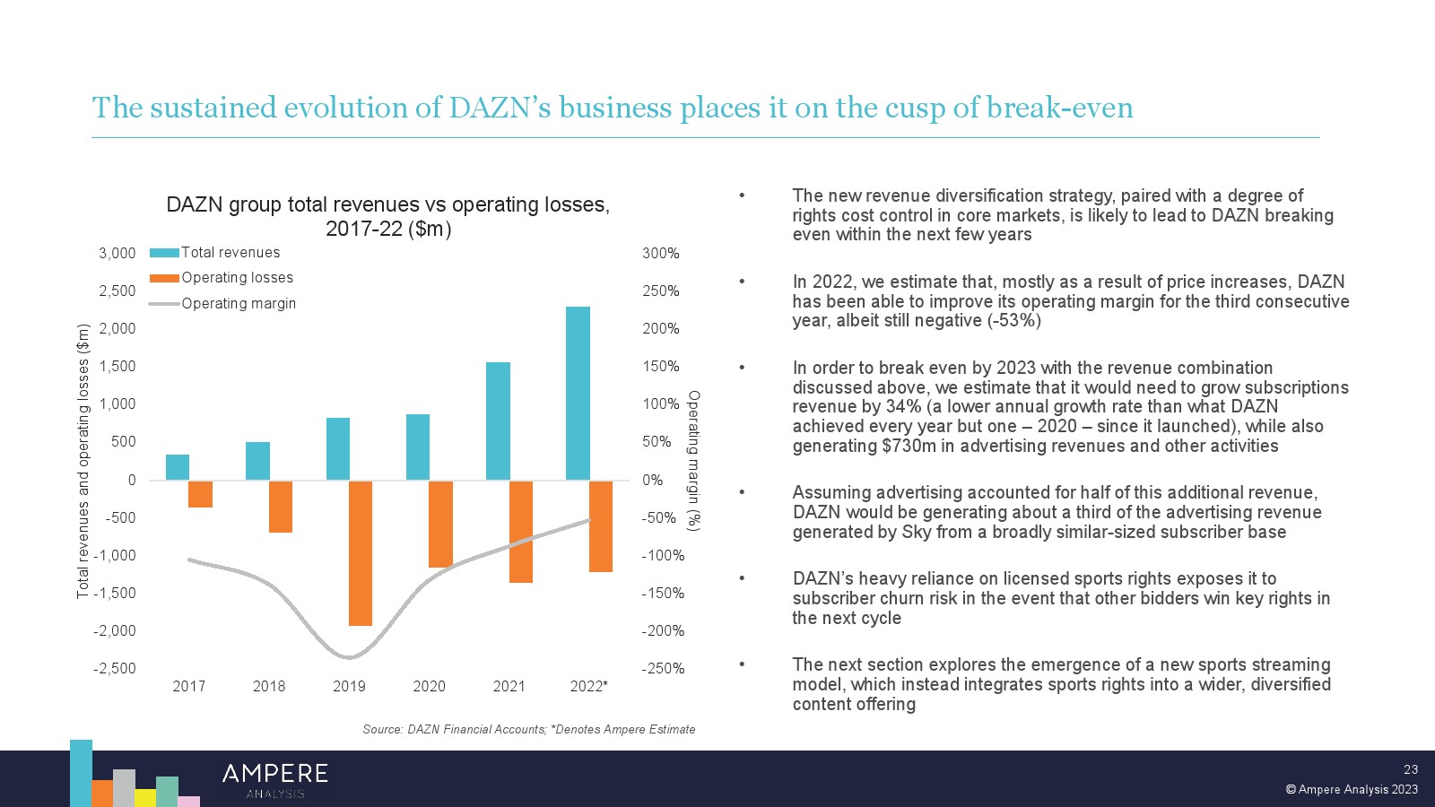 DAZN 以大胆的战略瞄准顶级版权并提供低价、直接面向消费者的优质体育赛事,在多个市场处于领先地位。2022 年,DAZN 占所有订阅 OTT 服务体育转播权支出的 54%。 DAZN 的战略重点现在正从消费者增长和国际扩张转向通过价格上涨和收入多元化战略关注长期盈利能力。