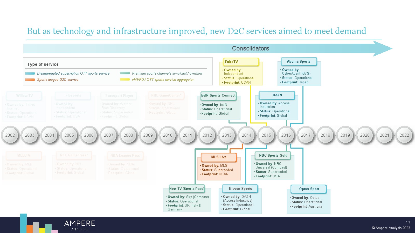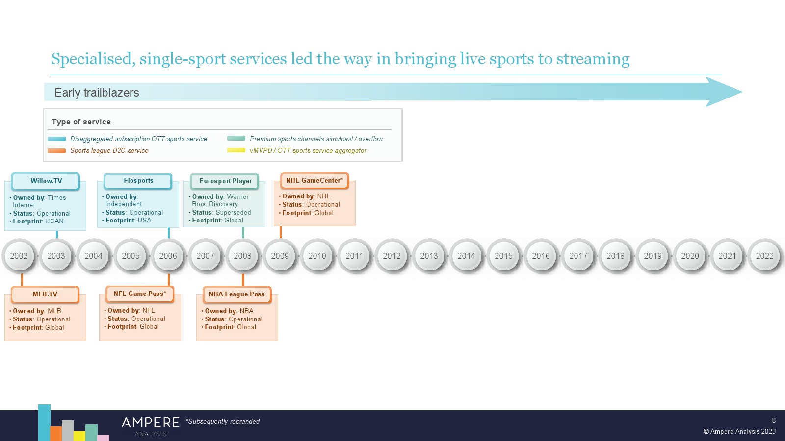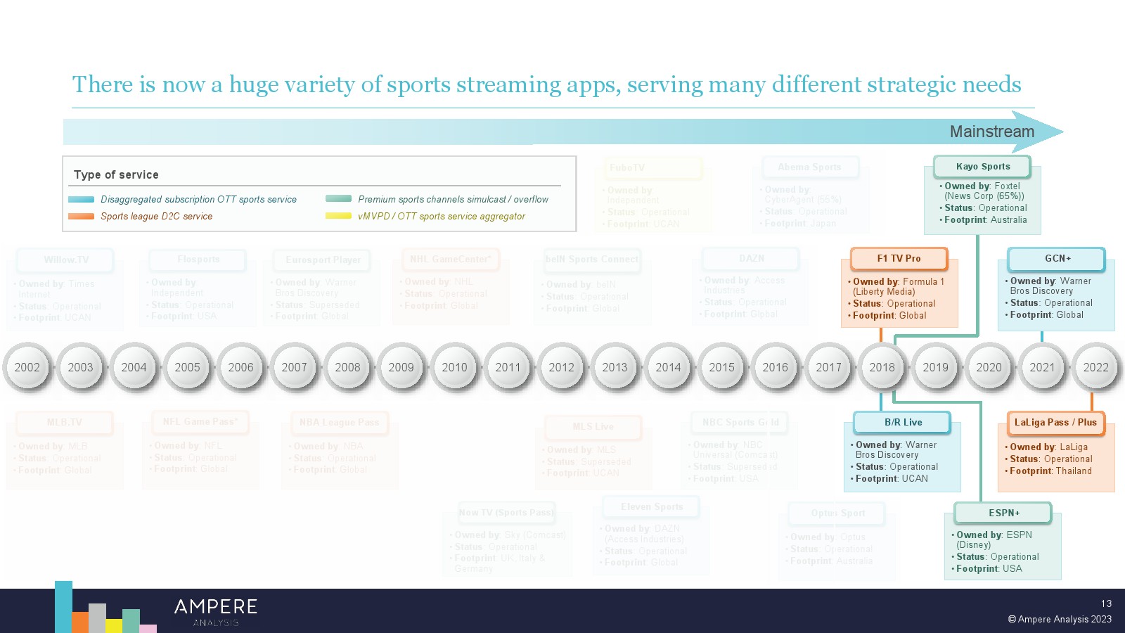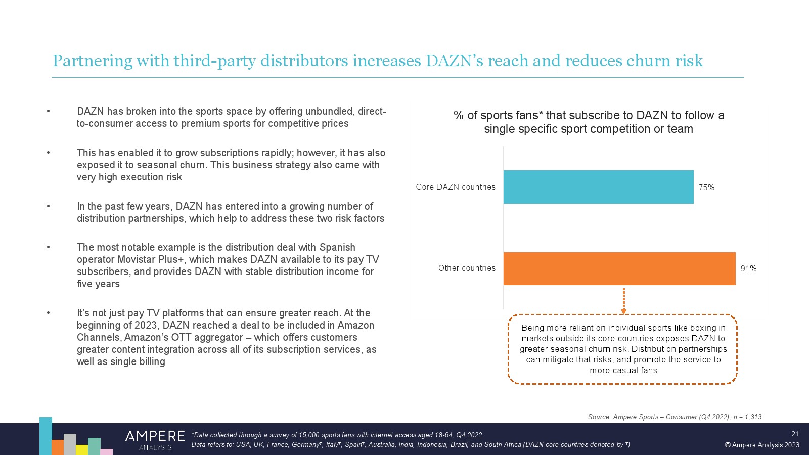 DAZN 以大胆的战略瞄准顶级版权并提供低价、直接面向消费者的优质体育赛事,在多个市场处于领先地位。2022 年,DAZN 占所有订阅 OTT 服务体育转播权支出的 54%。 DAZN 的战略重点现在正从消费者增长和国际扩张转向通过价格上涨和收入多元化战略关注长期盈利能力。