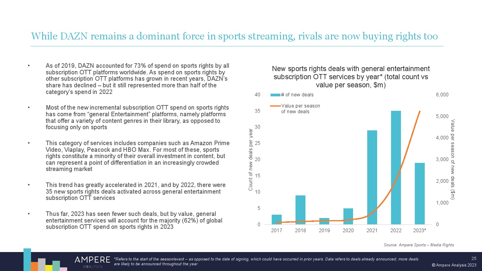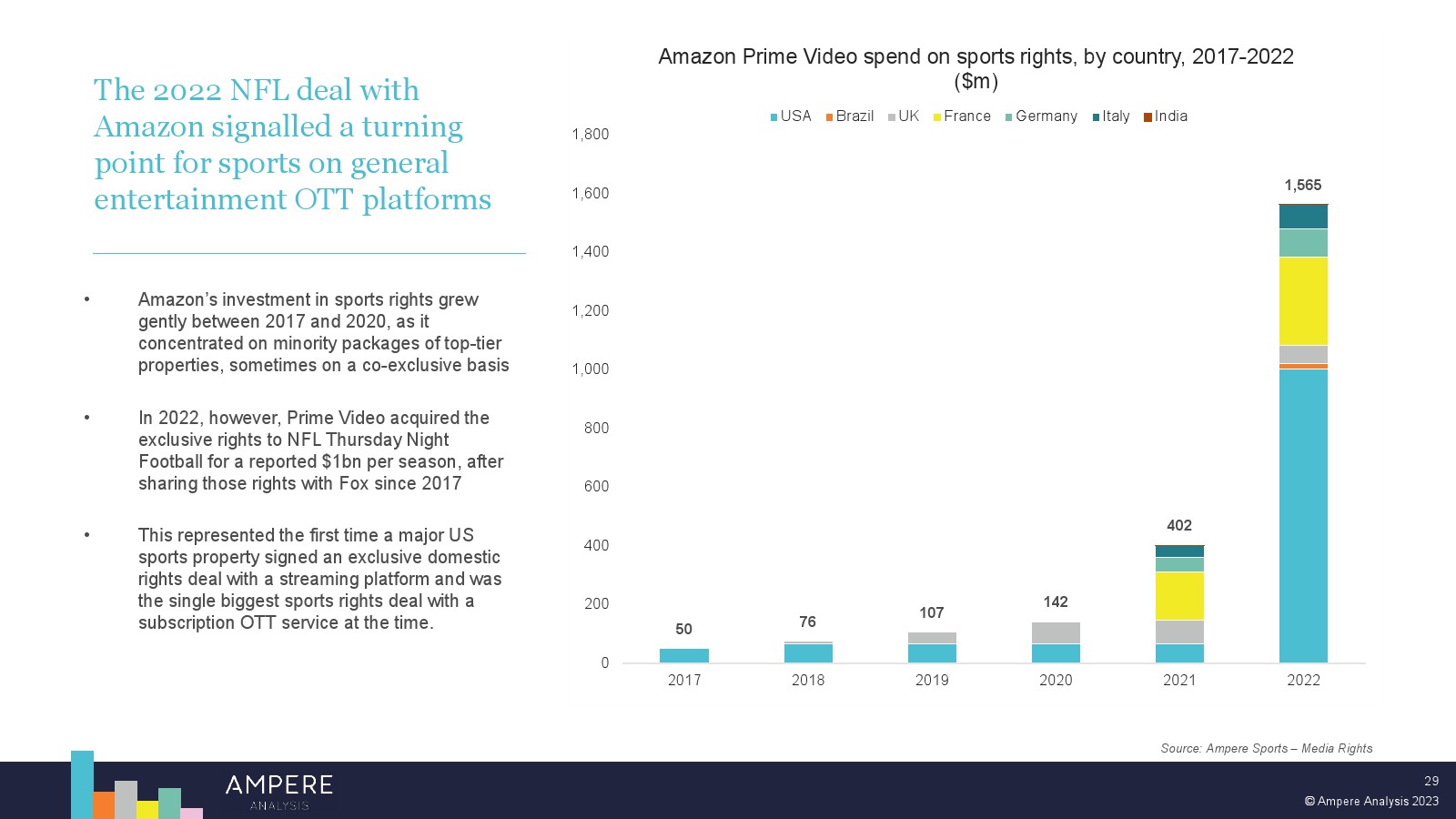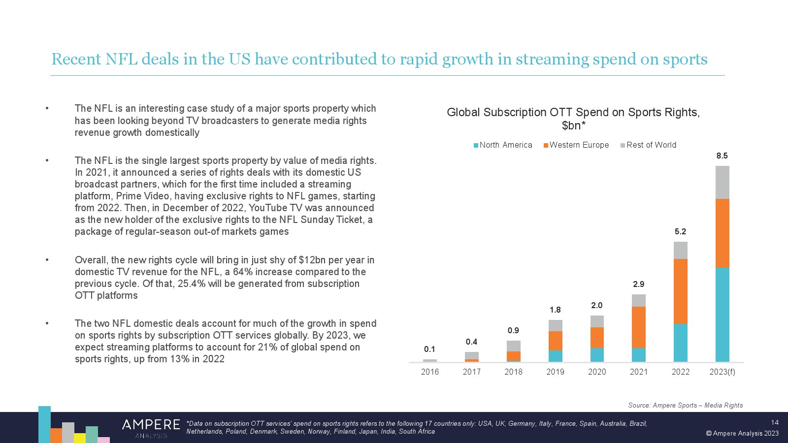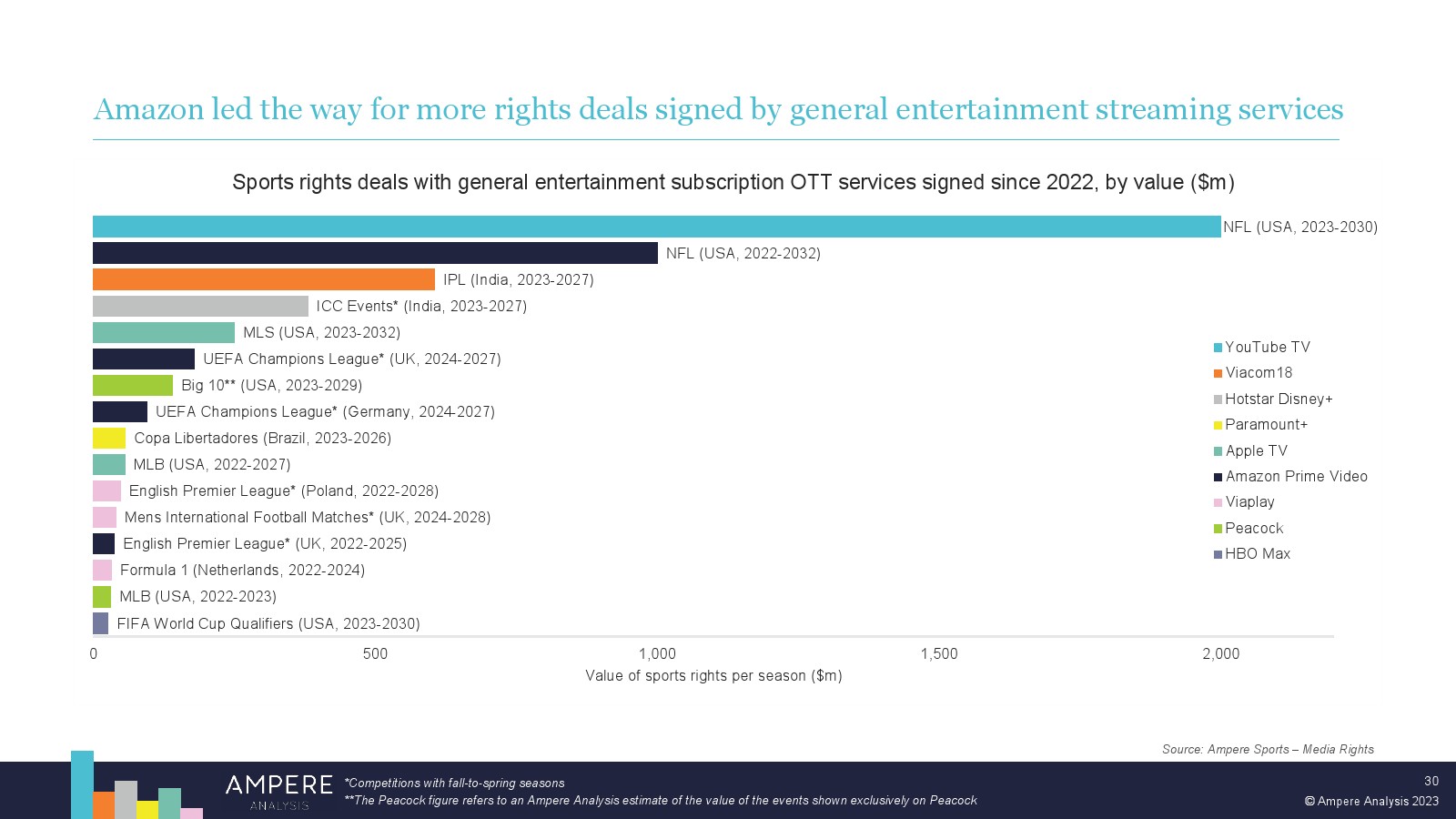 近年来,Peacock 和 Viaplay 等一般娱乐流媒体公司在体育转播权方面的支出加速增长,因为他们希望在日益拥挤的市场中与同行区分开来。2022 年开始与亚马逊的独家 NFL 交易可以说是这些平台体育内容的转折点,这是迄今为止所有体育流媒体服务签署的最大单笔交易,此后仅被 YouTube 超越,也包括与 NFL 的交易。