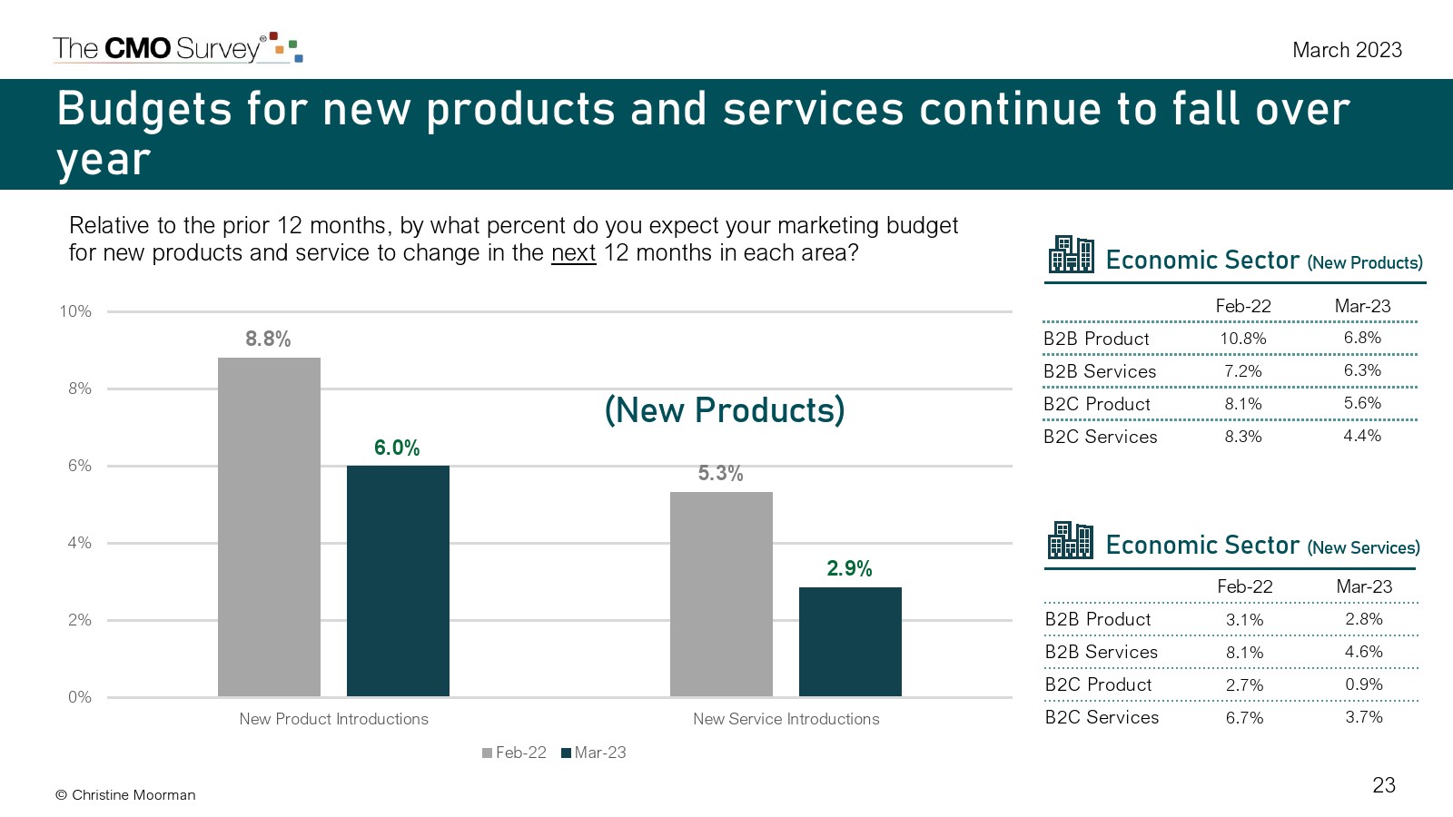 尽管如此,结果确实描绘了预算受到威胁的趋势。在此前的调查中,CMO 报告说他们的预算比上一年增长了 2.9%。在最近的一项调查中,这个数字高达 10.4%。