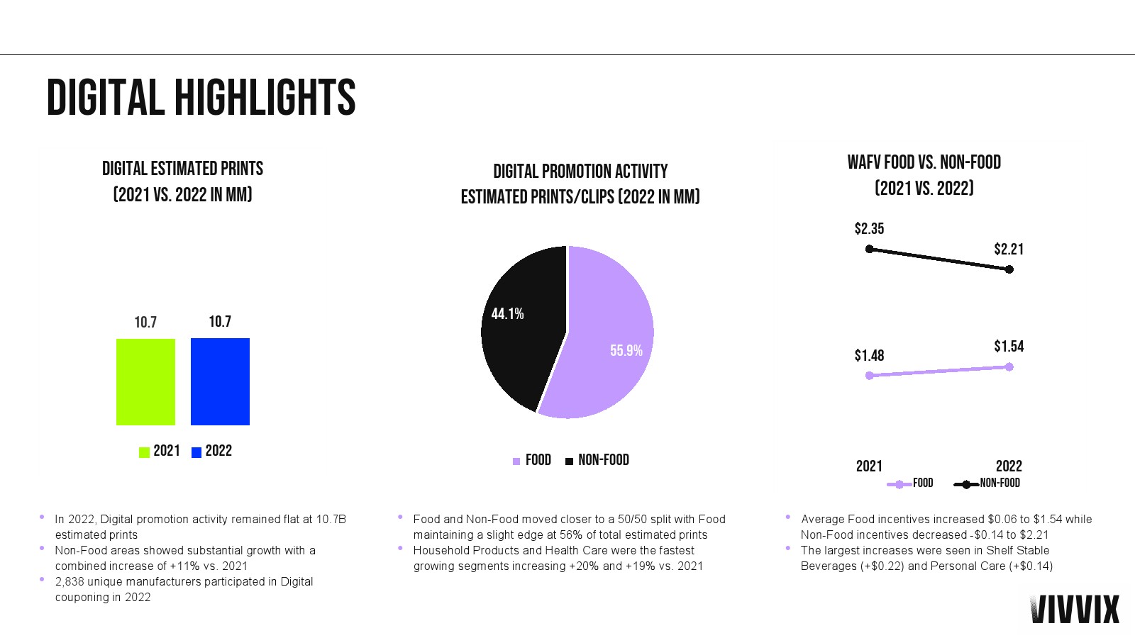 促销活动因方式而异。 在印刷品中,非食品优惠券占主导地位,占总数的 88%(比 2021 年高 4%,比 2020 年高 8%);而数字印刷/剪辑更倾向于食品优惠券(55.9%)。