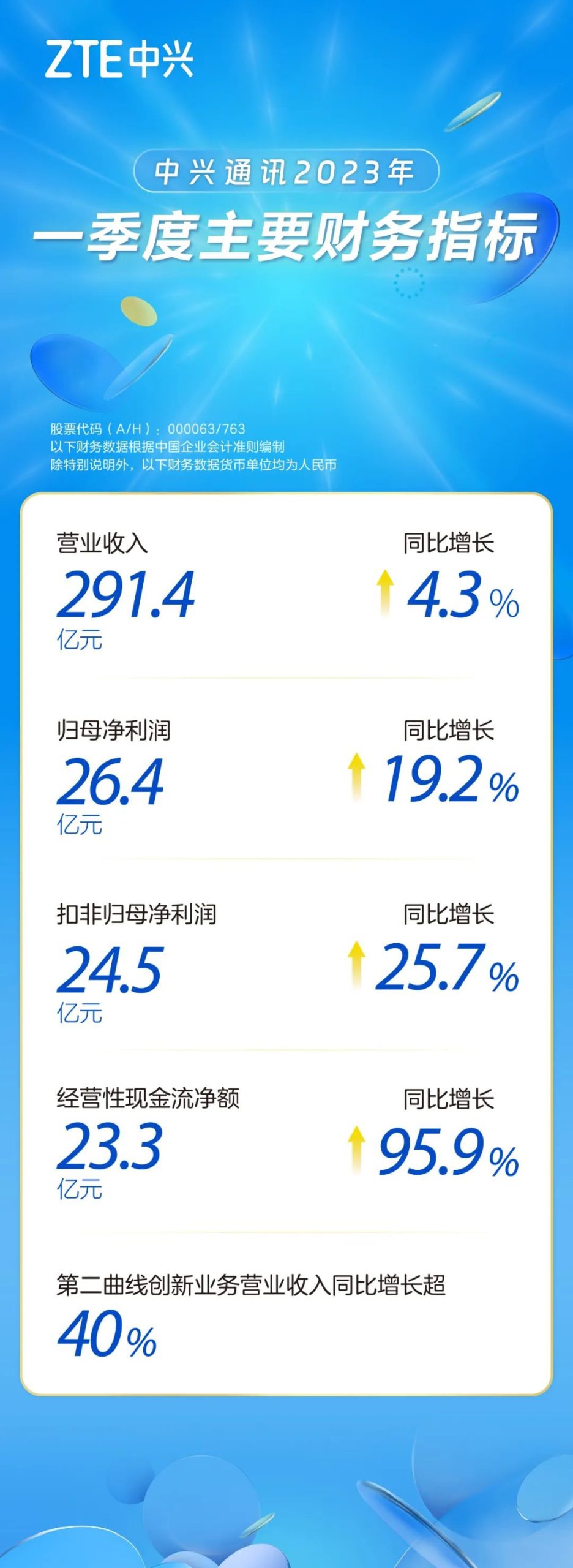 近日消息,中兴通讯发布了 2023 年第一季度报告。报告内容显示,2023 年 1-3 月,中兴通讯实现营业收入 291.4 亿元,同比增长 4.3%;归母净利润 26.4 亿元,同比增长 19.2%;扣非归母净利润 24.5 亿元,同比增长 25.7%;经营性现金流净额达 23.3 亿元,同比增长 95.9%。