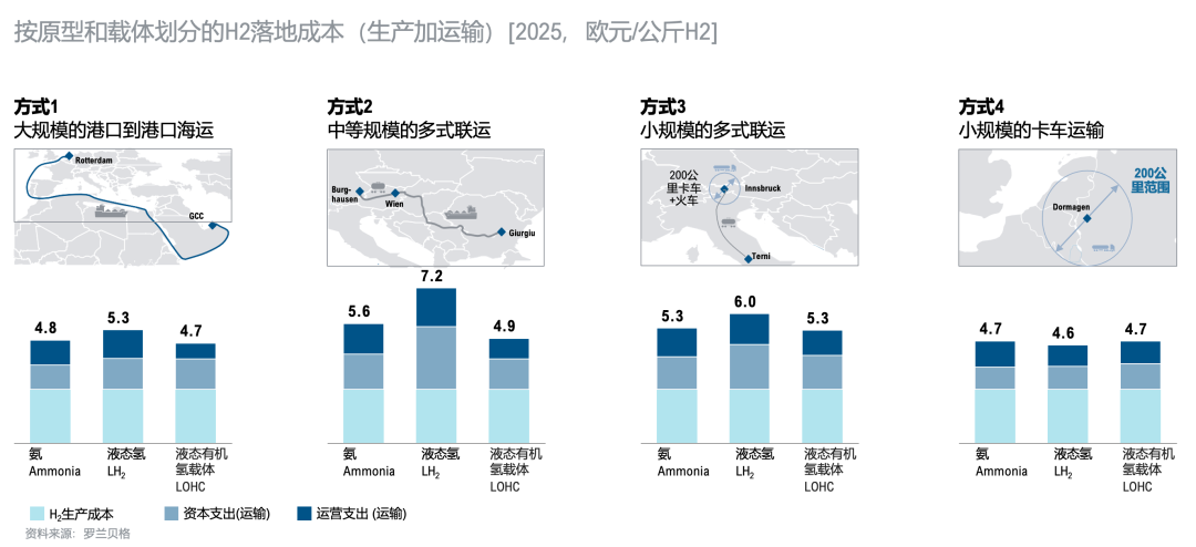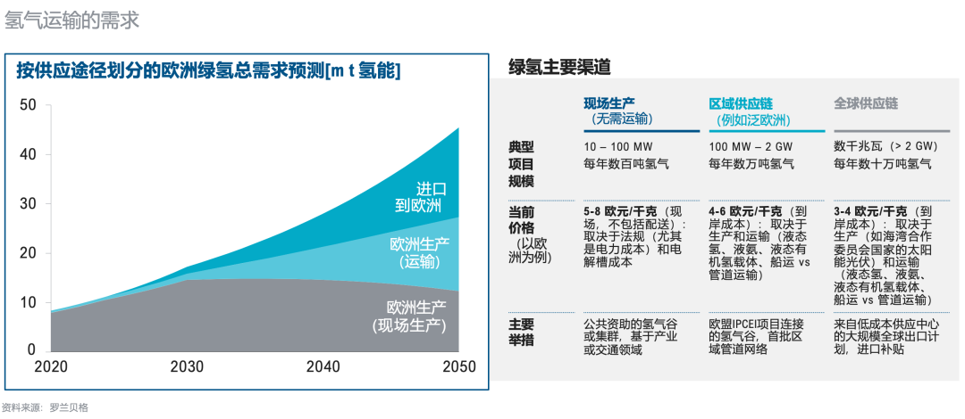 全球绿氢需求中心(如欧洲)将无法实现自给自足,因此运输成为解锁全球氢经济的关键环节。尽管氢气运输困难且成本高昂,但却是不可或缺的。罗兰贝格认为现场生产、区域供应链和全球供应链是三种不同的氢气供应链模式,各具特点和优势。